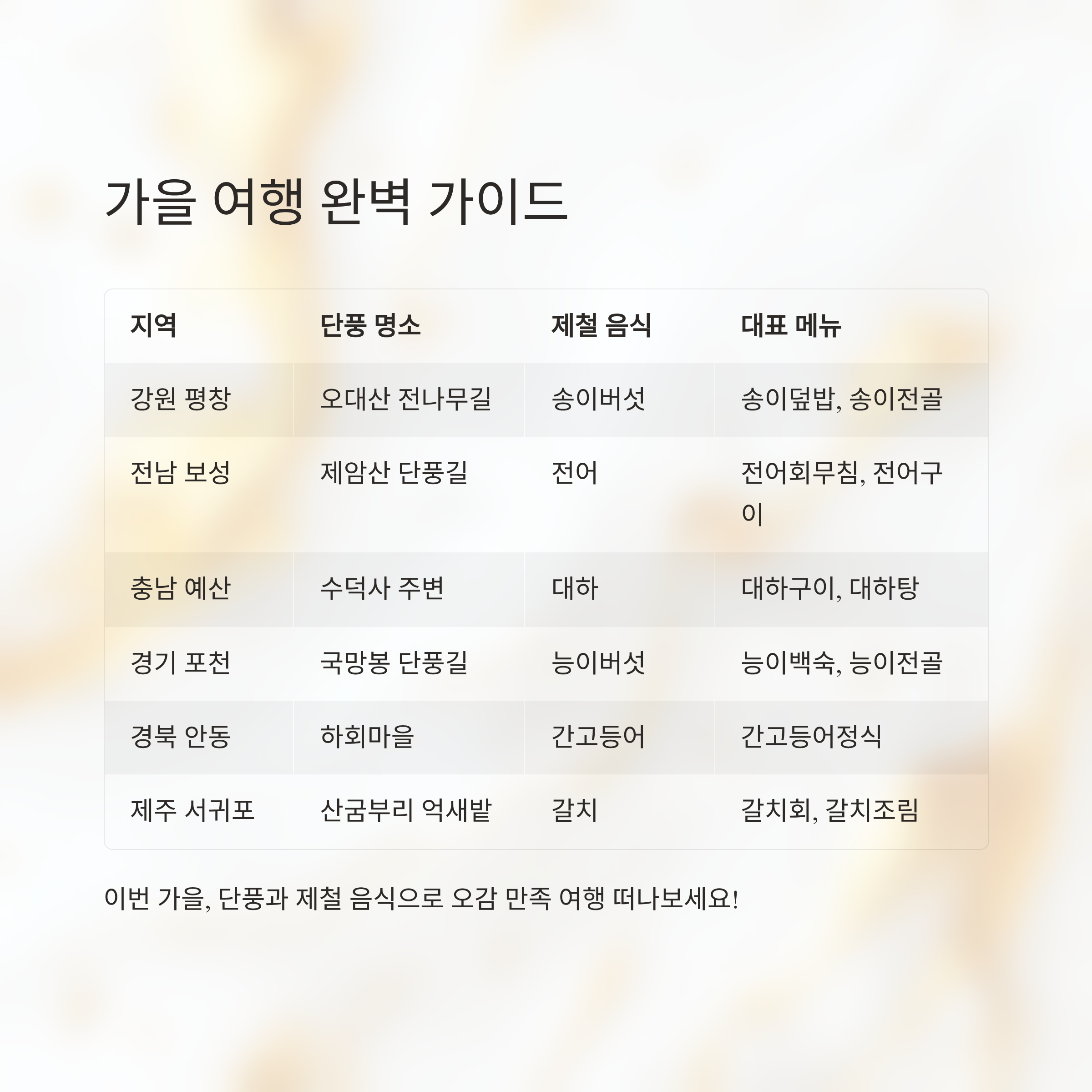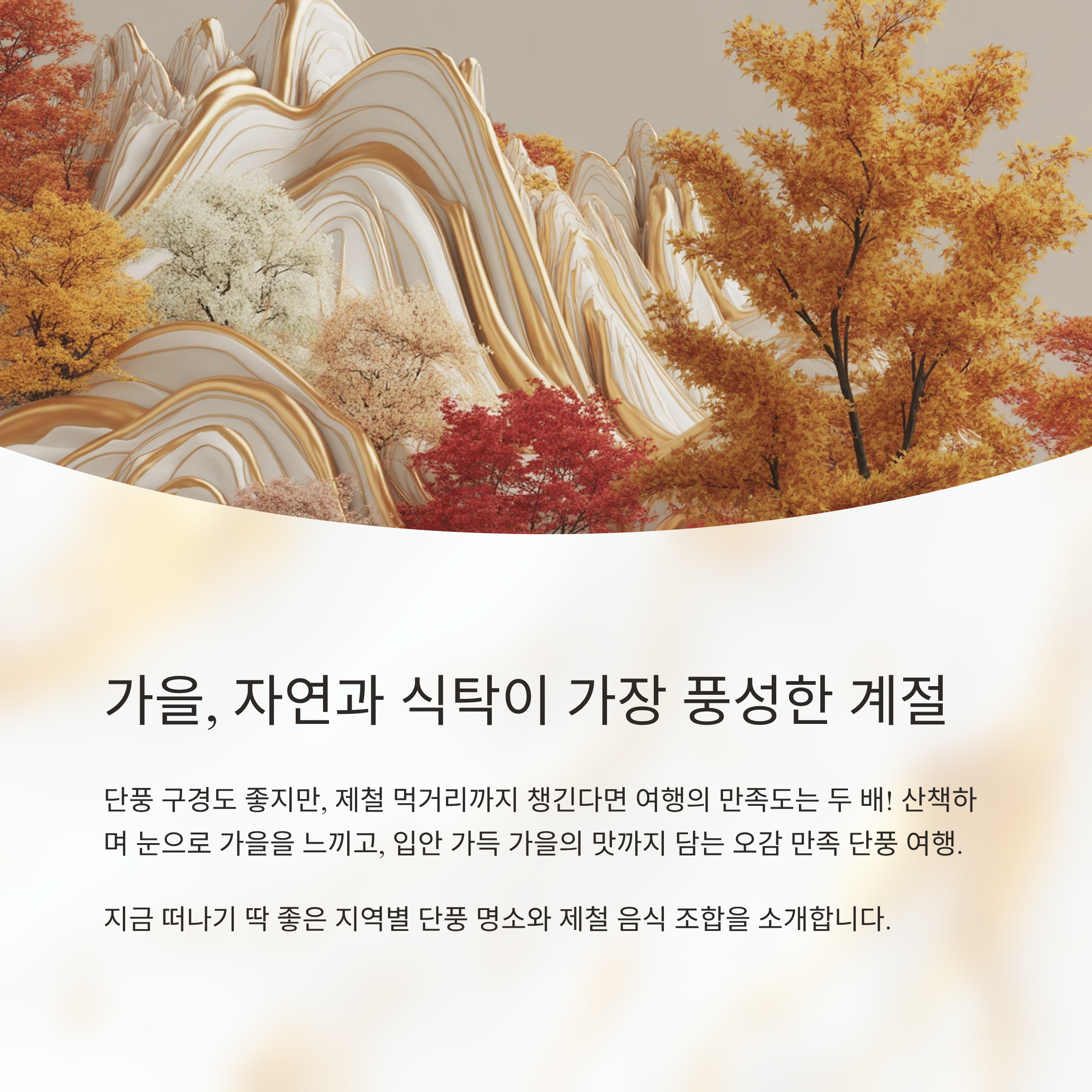 가을은 자연이 가장 화려해지는 계절이자, 식탁도 가장 풍성해지는 때입니다. 단풍 구경도 좋지만, 이왕이면 제철 먹거리까지 챙긴다면 여행의 만족도는 두 배가 되겠죠. 산책하며 눈으로 가을을 느끼고, 입안 가득 가을의 맛까지 담는 ‘오감 만족’ 단풍 여행 코스! 지금 떠나기 딱 좋은 지역별 단풍 명소와 함께 즐기는 제철 음식 조합을 소개해드릴게요.