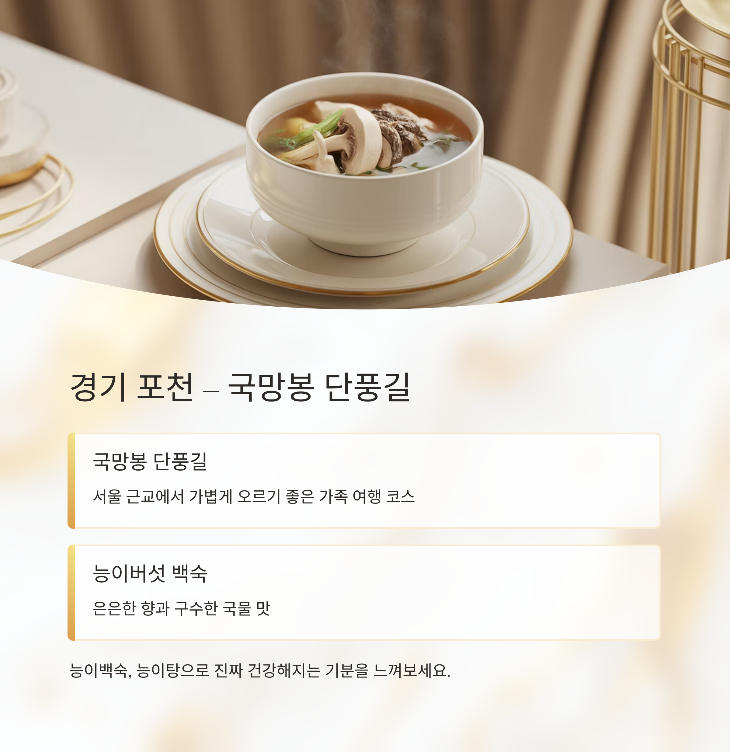 | 경기 포천 | 국망봉 단풍길 | 능이버섯 | 능이백숙, 능이전골 |