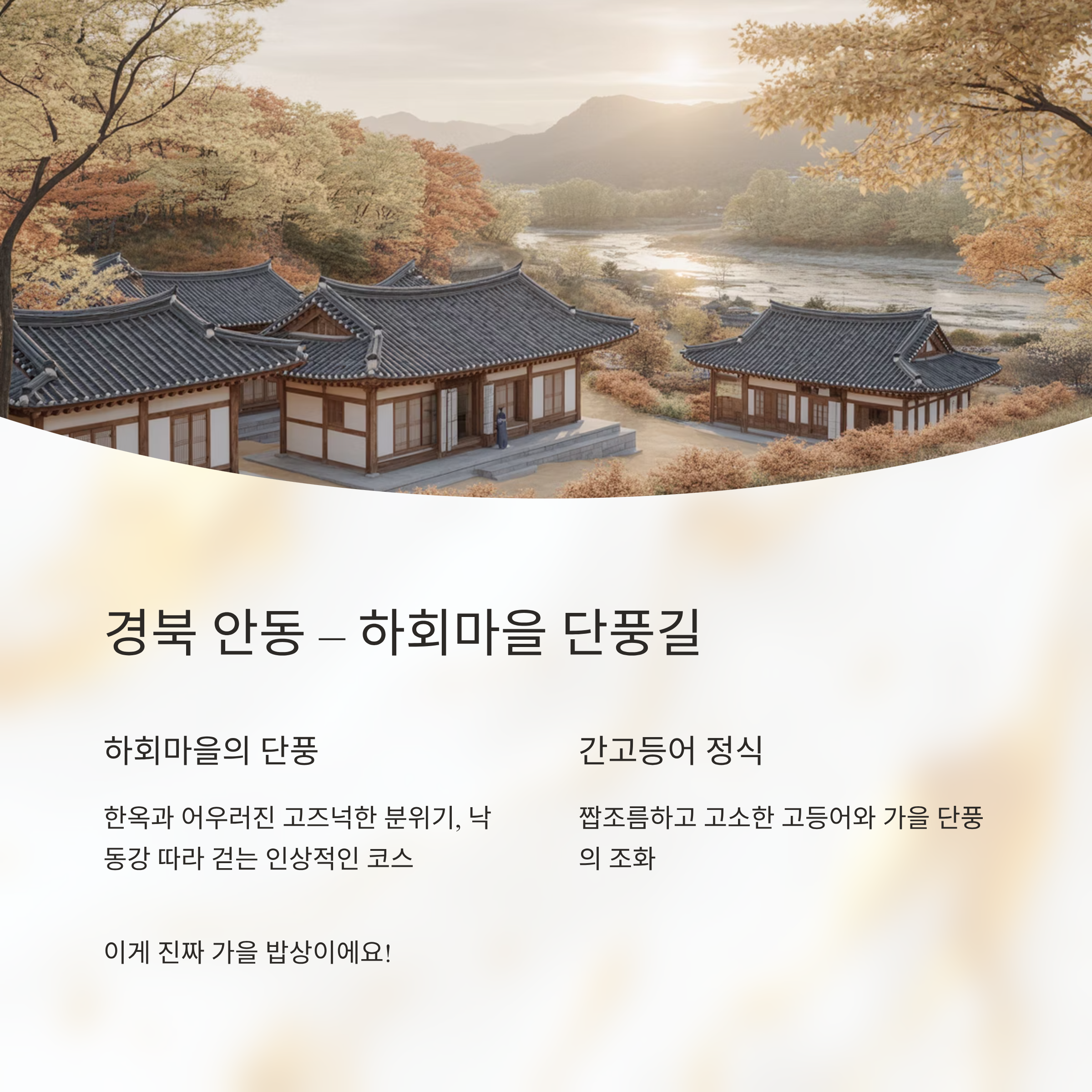 | 경북 안동 | 하회마을 단풍길 | 간고등어 | 간고등어정식, 청국장 곁들임 |