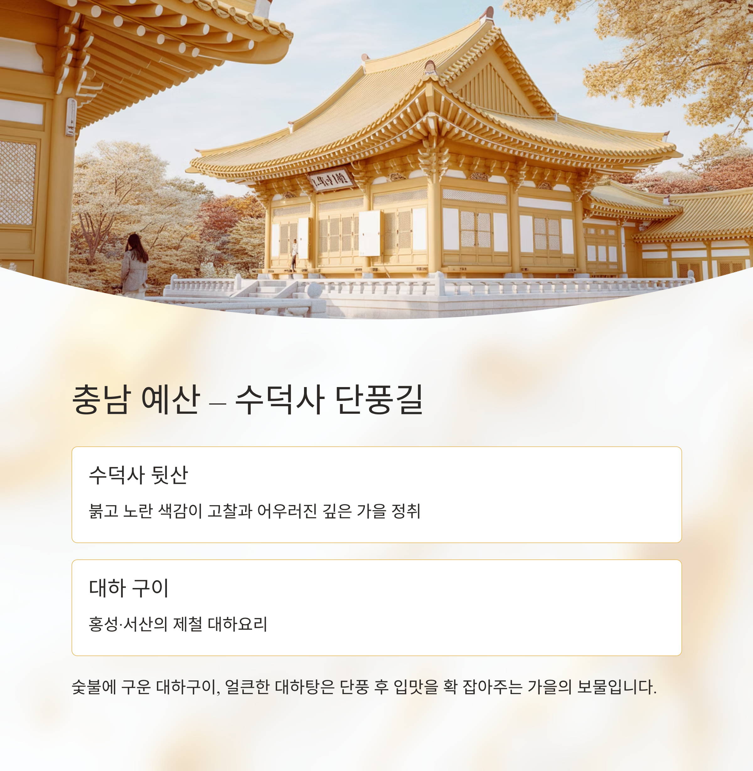 | 충남 예산 | 수덕사 주변 산책길 | 대하 | 대하구이, 대하탕 |