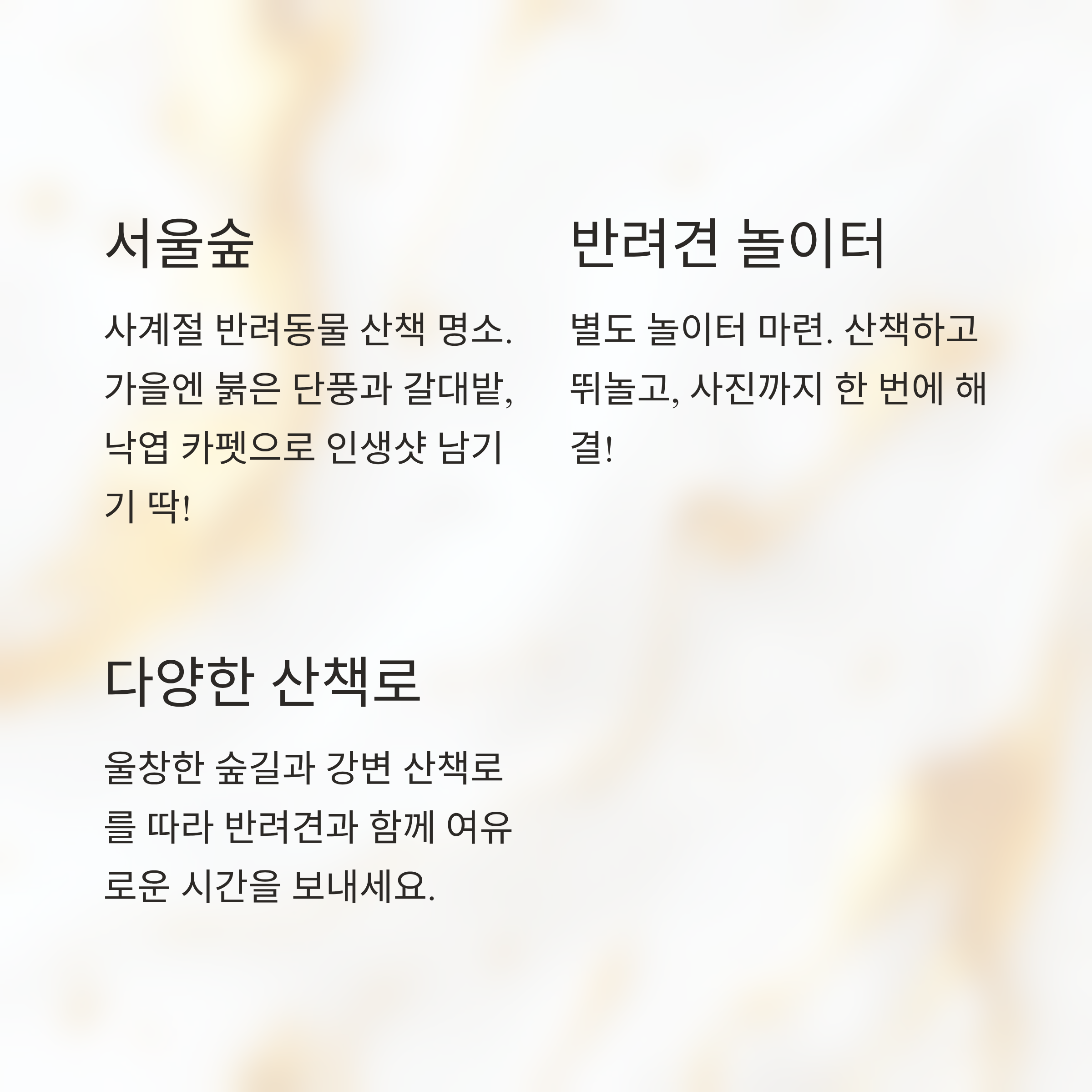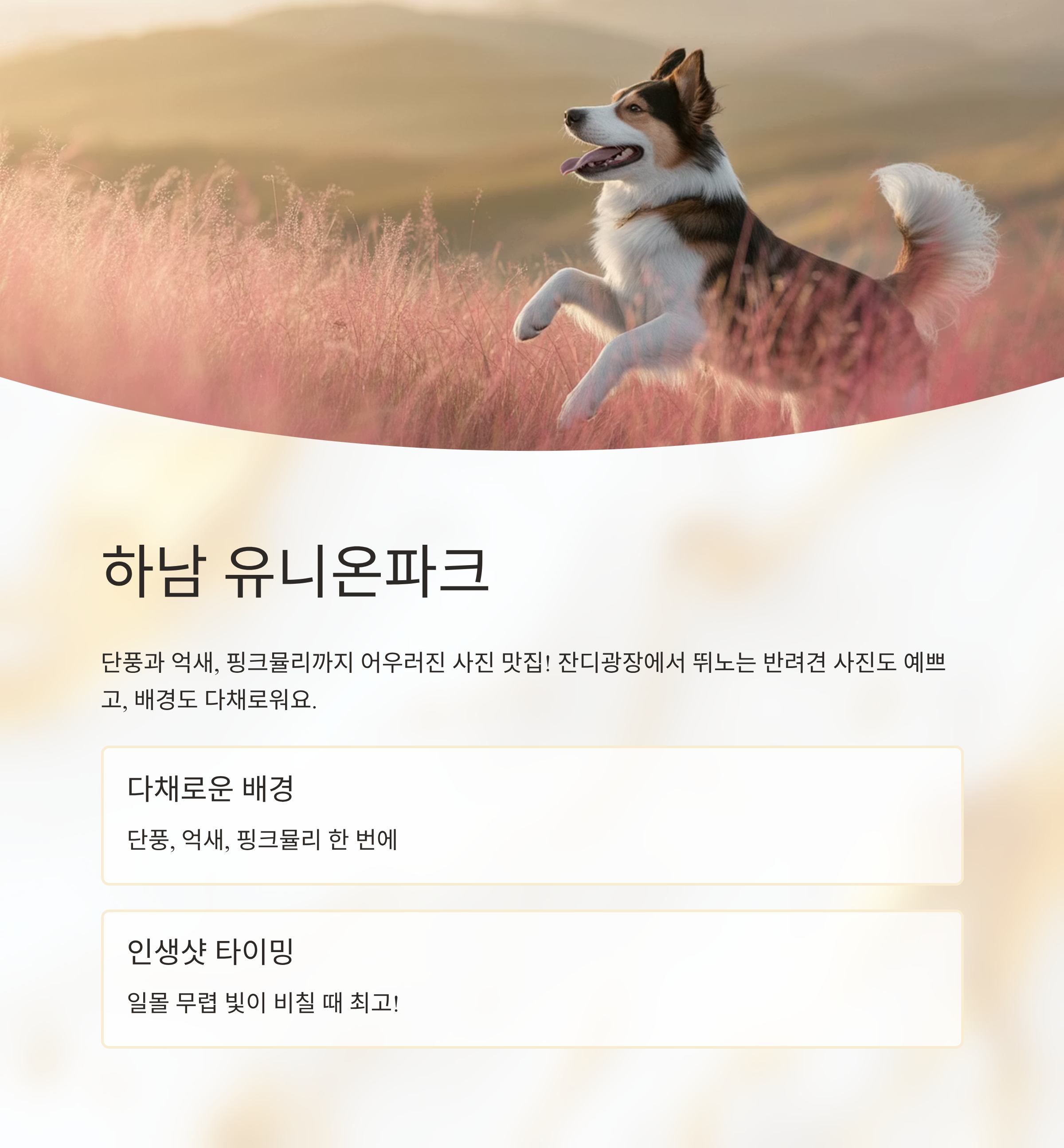 잔디광장에서 뛰노는 반려견 사진도 예쁘고, 배경도 다채로워요.