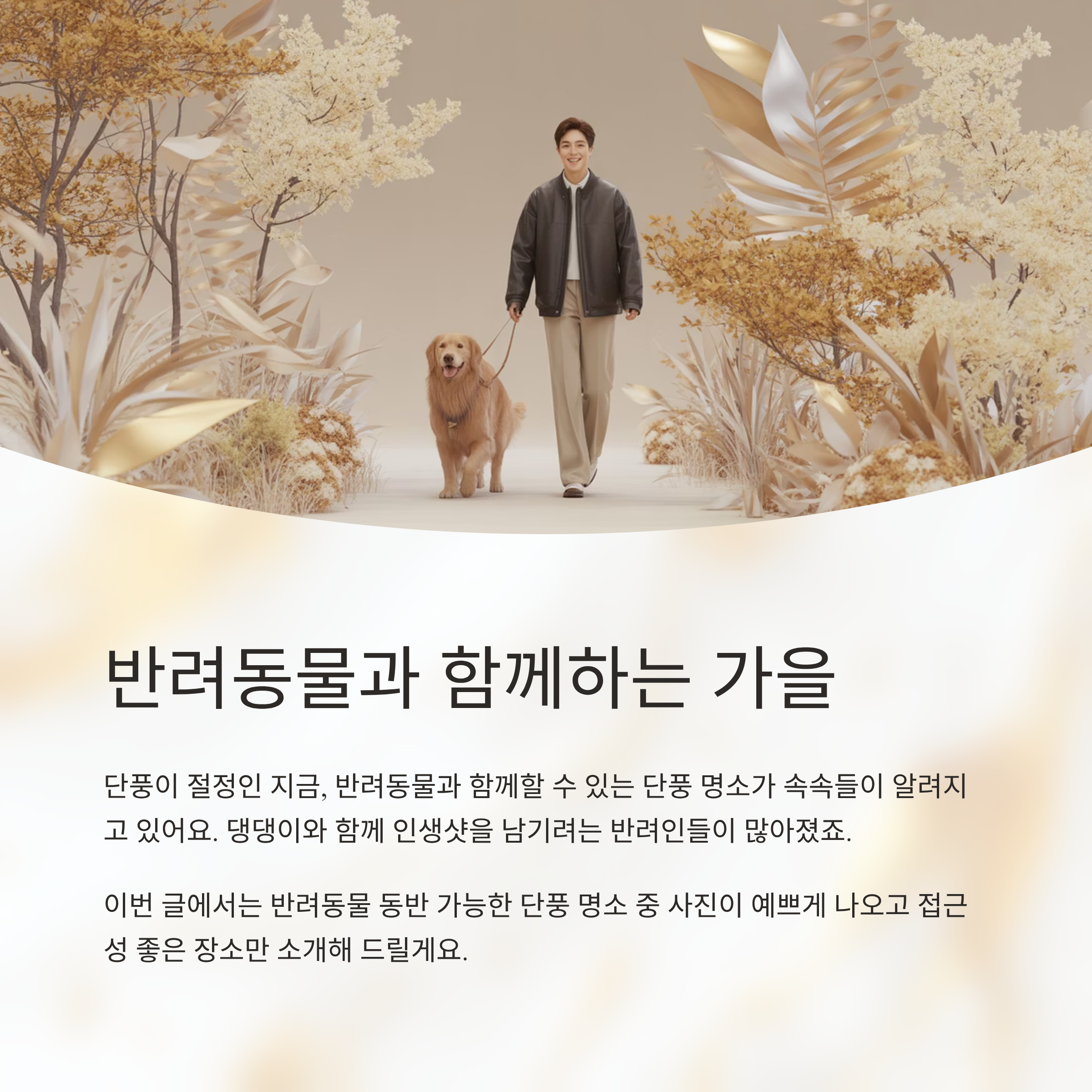 단풍이 절정인 지금, 사람들만 가을을 즐길 수는 없죠. 반려동물과 함께할 수 있는 단풍 명소가 속속들이 알려지면서, 댕댕이와 함께 인생샷을 남기려는 반려인들이 많아졌어요. 이번 글에서는 반려동물과 동반 가능한 단풍 명소 중에서도 사진이 예쁘게 나오는, 접근성 좋은 장소만 콕 집어 소개해 드릴게요. 반려견 동반 시 유의사항도 함께 알려드립니다.