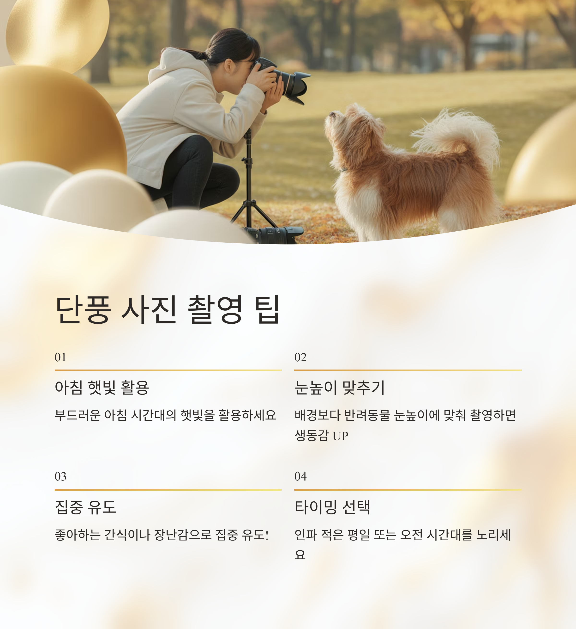 - 배경보다 반려동물 눈높이에 맞춰 촬영하면 생동감이 살아나요.