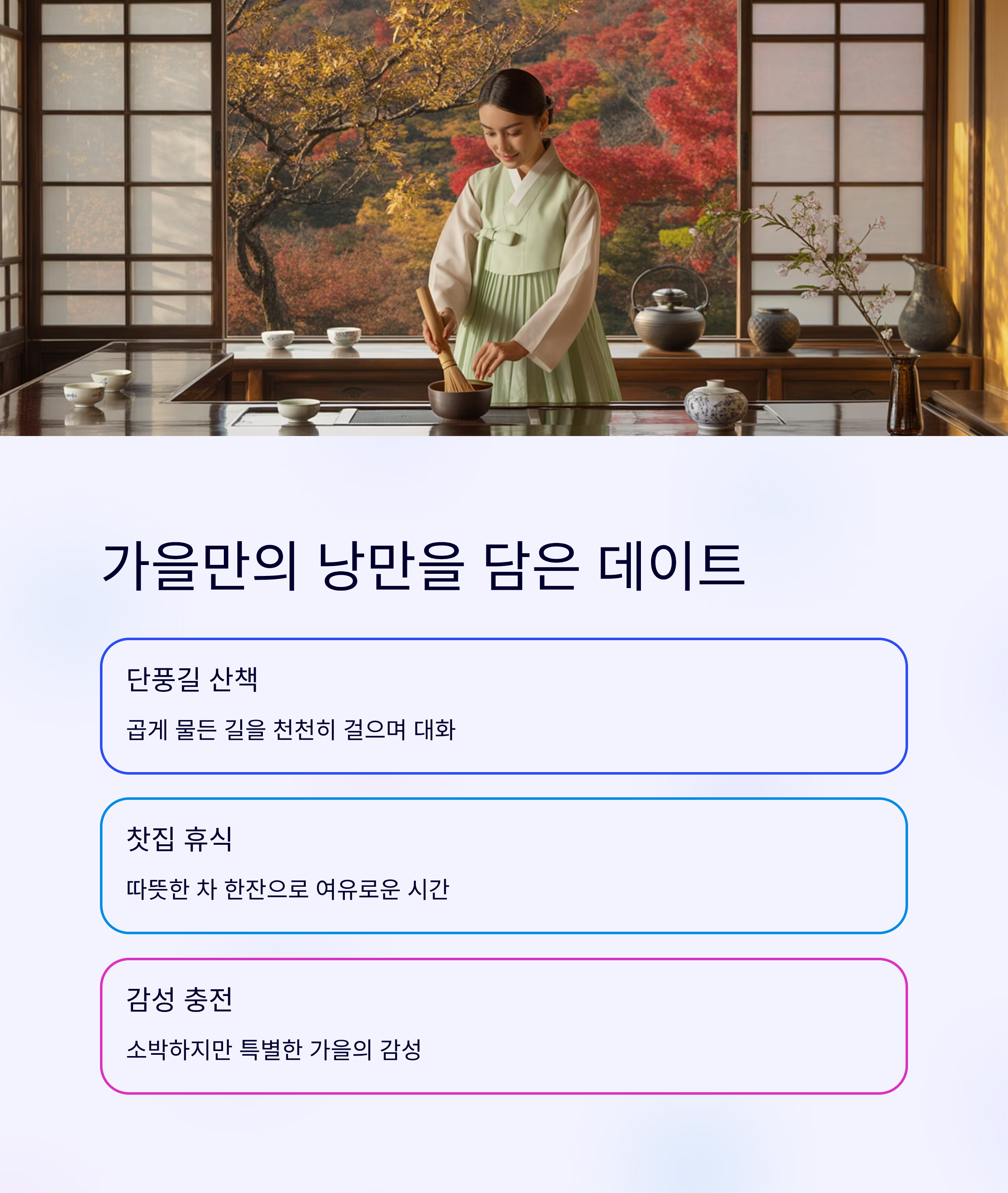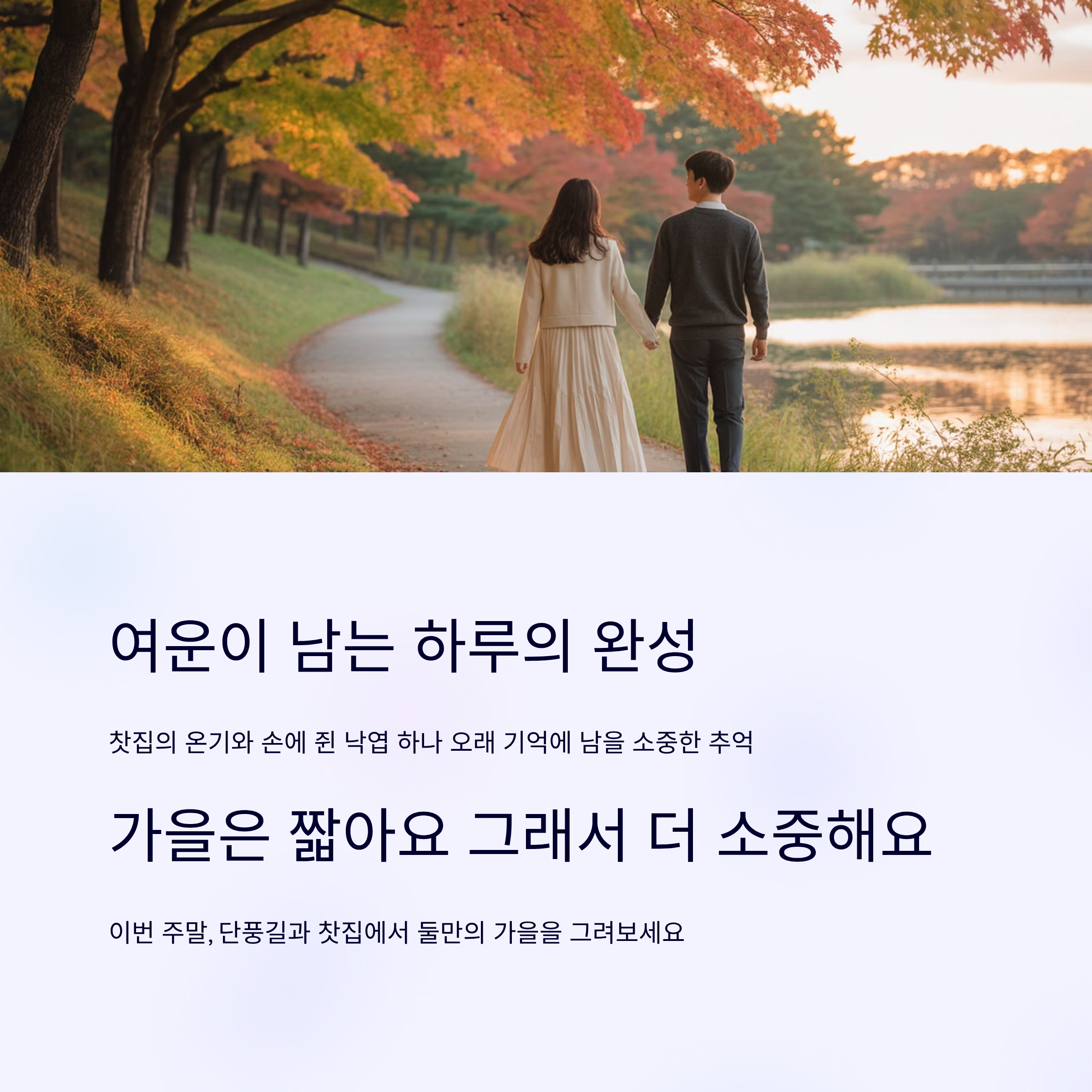 가을은 짧아요. 그래서 더 소중해요. 이번 주말, 단풍길과 찻집에서 둘만의 가을을 그려보세요.