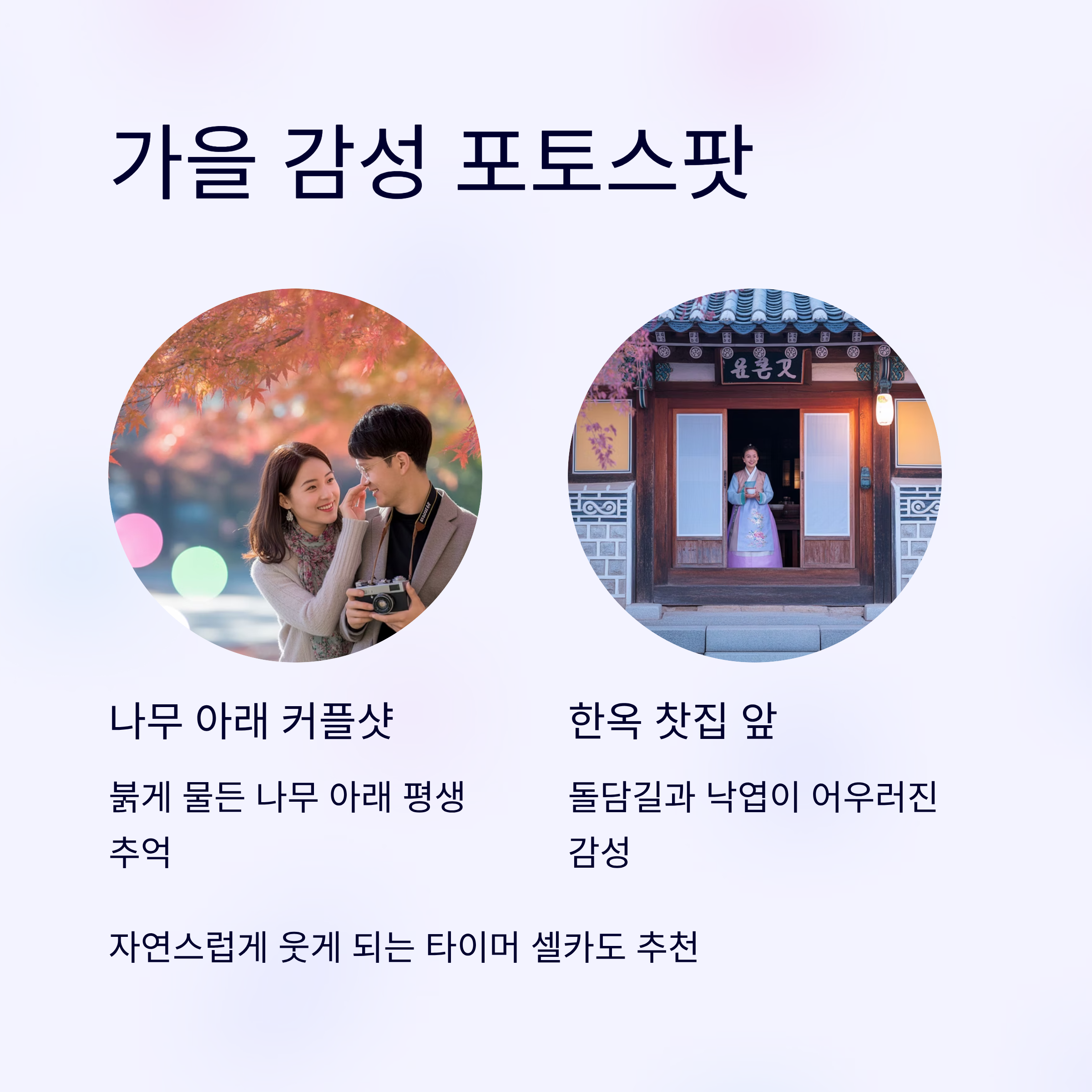 특히 한옥 찻집 앞이나 돌담길 옆, 혹은 낙엽이 수북한 계단 같은 포인트는 누구나 감성적인 사진을 남길 수 있어요. 타이머 셀카도 좋고, 서로 찍어주는 것도 괜찮아요. 자연스럽게 웃게 되니까요.
