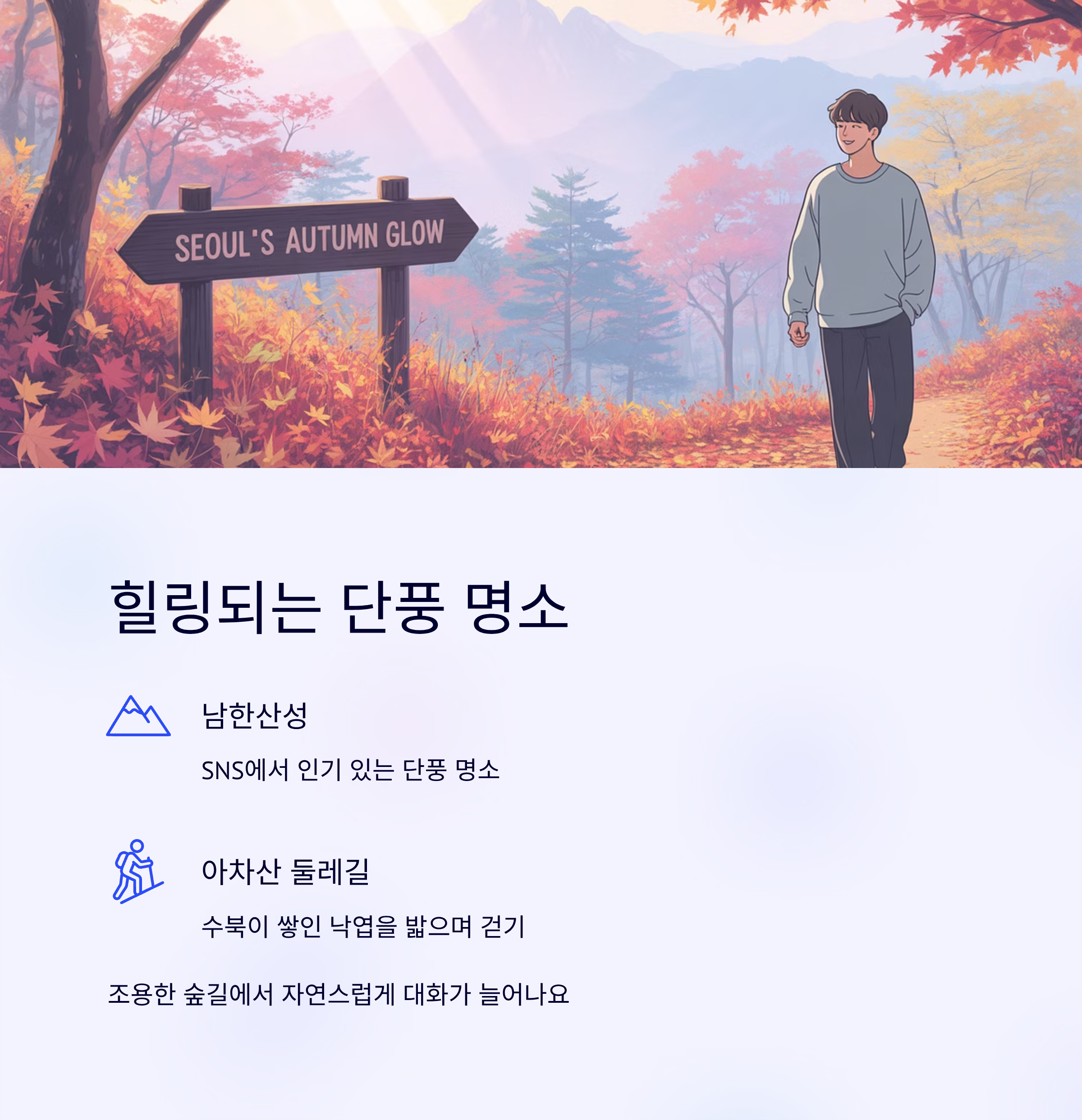 | 1단계 | 단풍길 산책 (예: 아차산, 경의선 숲길) | 붉게 물든 가을 풍경 속 걷기 |