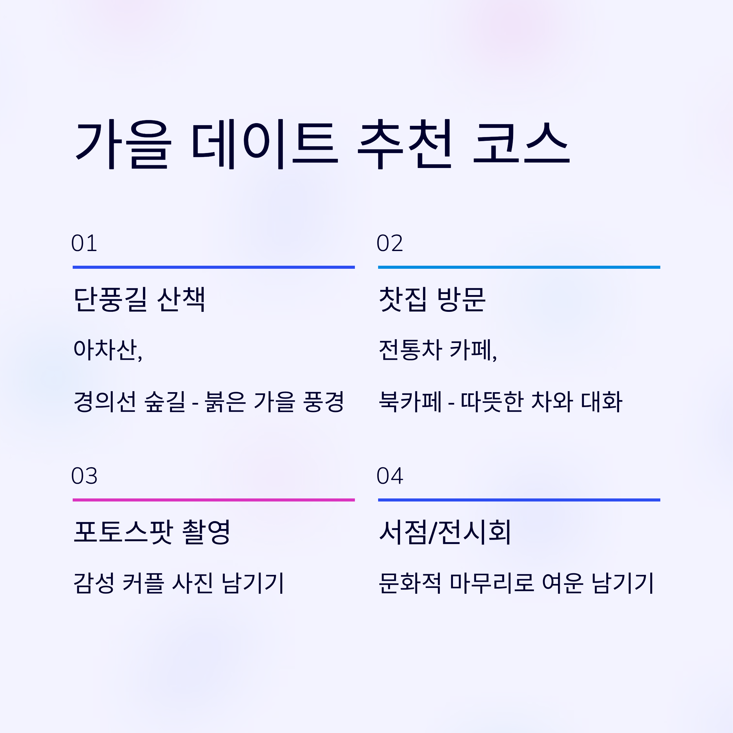 가을은 데이트하기에 가장 감성적인 계절이에요. 단풍이 곱게 물든 길을 천천히 걸으며 대화를 나누고, 가까운 찻집에서 따뜻한 차 한잔 마시며 잠시 쉬어가는 여유. 이 계절만의 낭만을 가득 담은 데이트 코스를 소개해 드릴게요. 소박하지만 특별한 하루, 가을이 주는 감성을 제대로 느껴보세요.