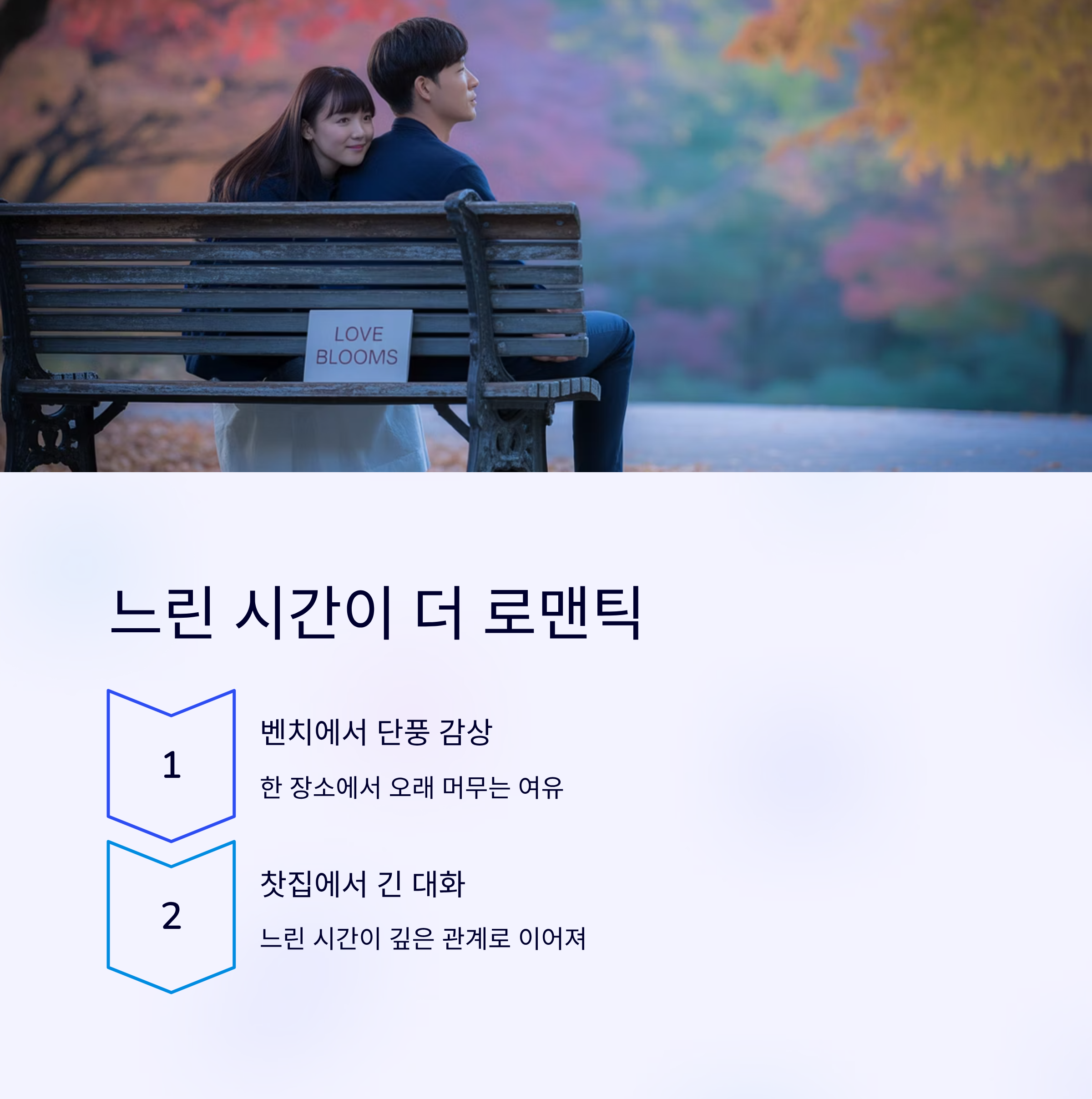 벤치에 앉아 단풍을 감상하거나, 찻집에서 긴 대화를 나누는 것. 그런 느린 시간이 쌓일수록 더 깊은 관계로 이어지게 되죠.
