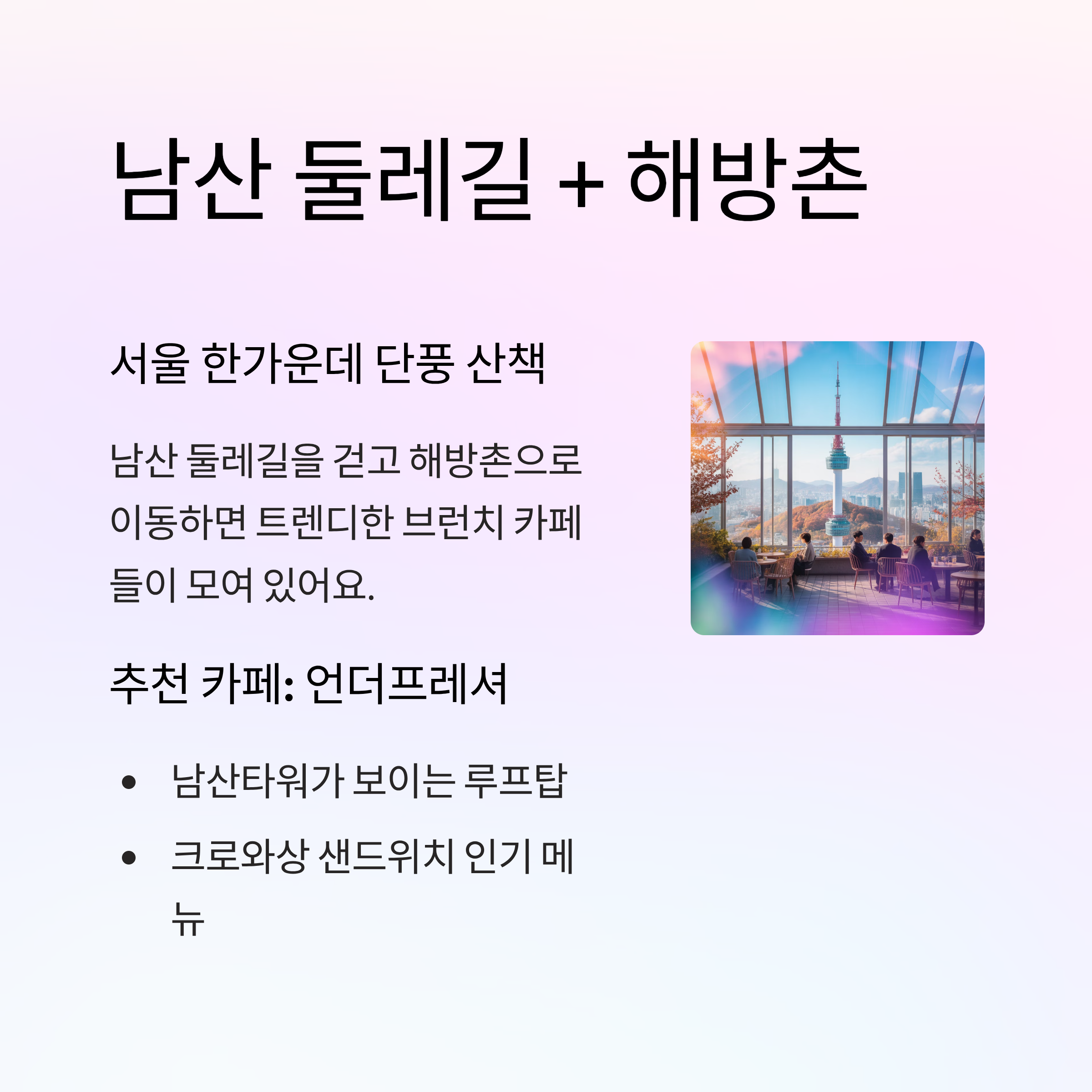 | 남산 둘레길 | 해방촌 | 언더프레셔 | 트렌디 루프탑 + 남산타워 뷰 |
