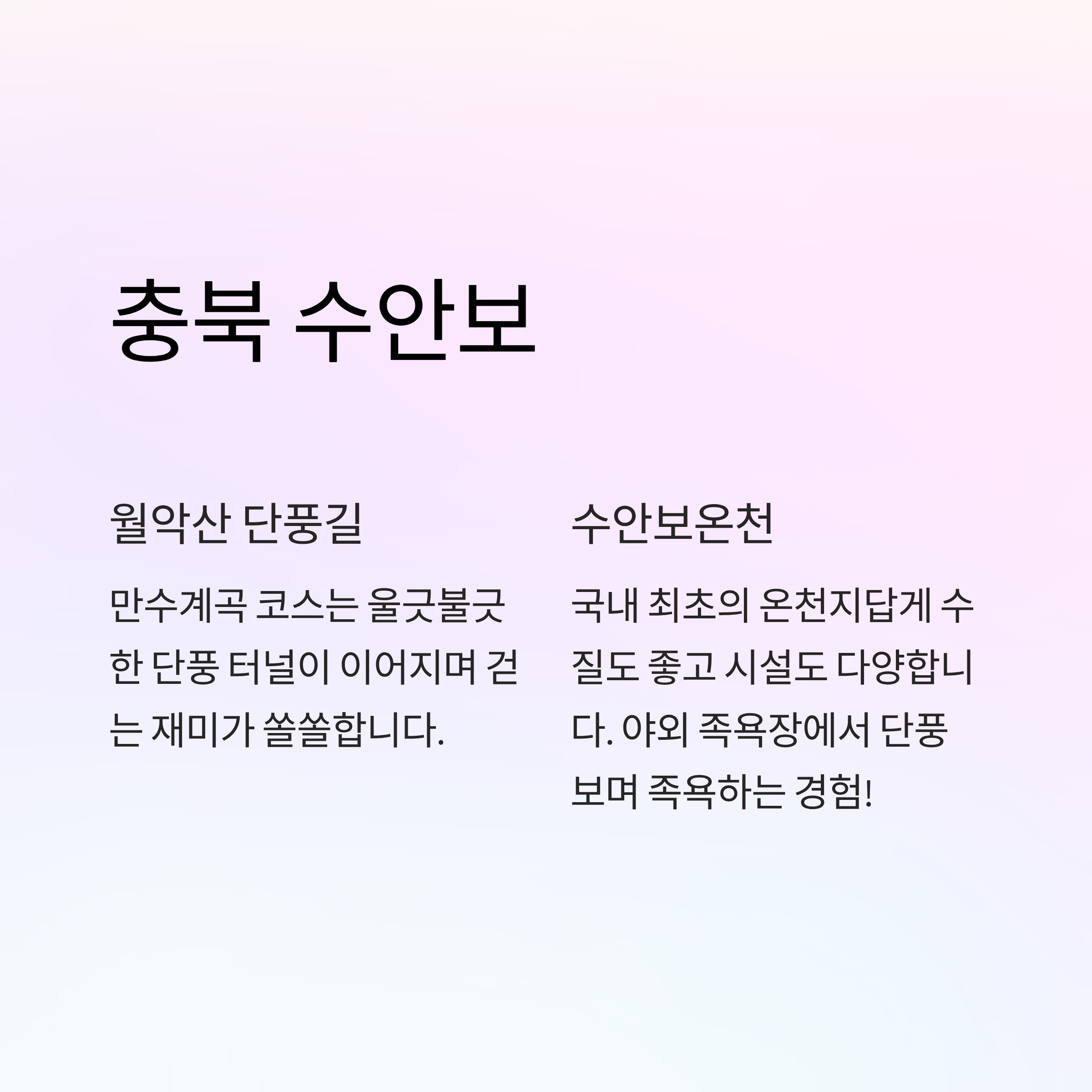 | 충북 충주 | 월악산 만수계곡 | 수안보온천 | 국내 최초 온천, 단풍 족욕 가능 |