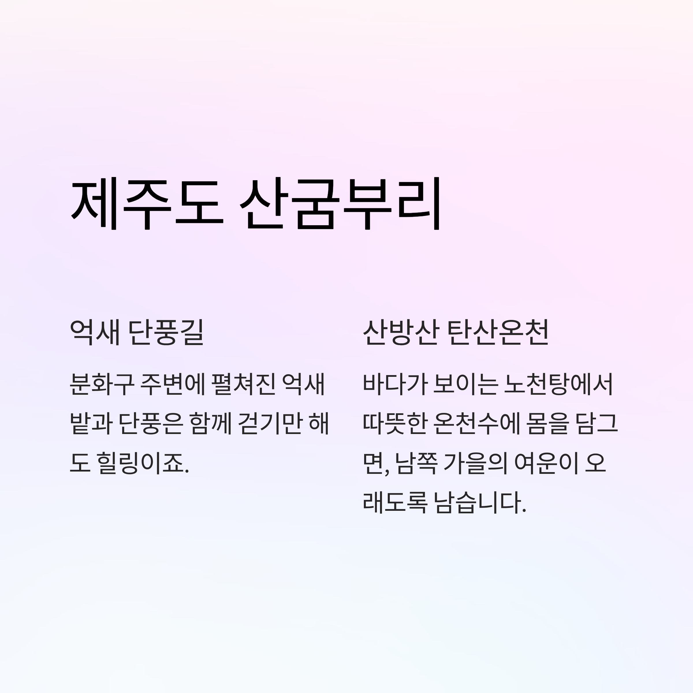 | 제주 서귀포 | 산굼부리 억새길 | 산방산 탄산온천 | 억새+단풍+바다뷰 노천탕 힐링 코스 |