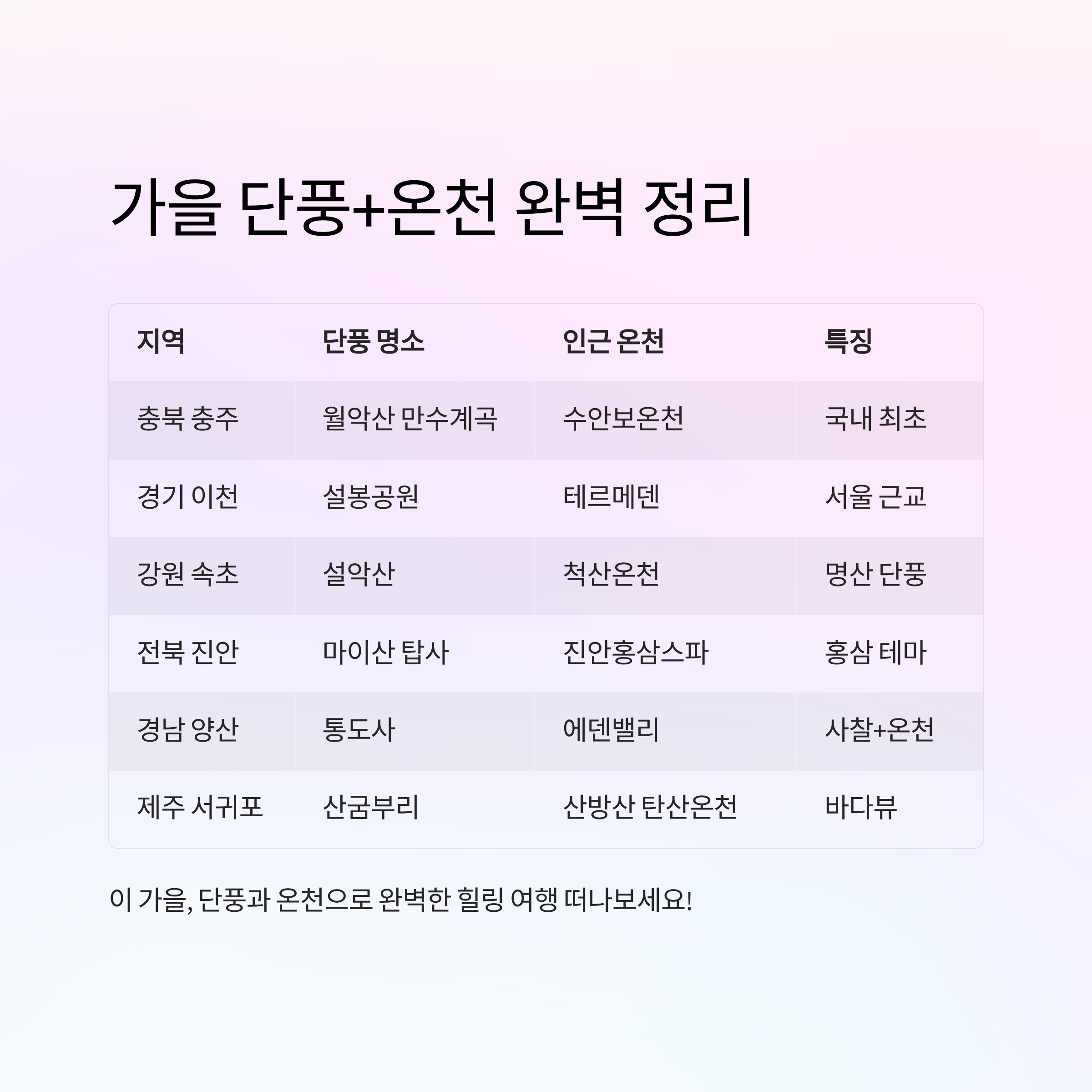 가을 단풍길을 걷고 나면 몸은 살짝 피곤하고, 바람은 점점 쌀쌀해지죠. 이럴 때 온천으로 마무리하는 하루는 말 그대로 ‘힐링의 정점’입니다. 자연이 주는 경이로운 색감에 흠뻑 취한 뒤, 따끈한 온천물에 몸을 담그면 가을 하루가 완성되는 기분. 오늘은 단풍 구경도 하고, 인근 온천에서 피로까지 풀 수 있는 최고의 단풍+온천 여행 코스를 소개해드릴게요.