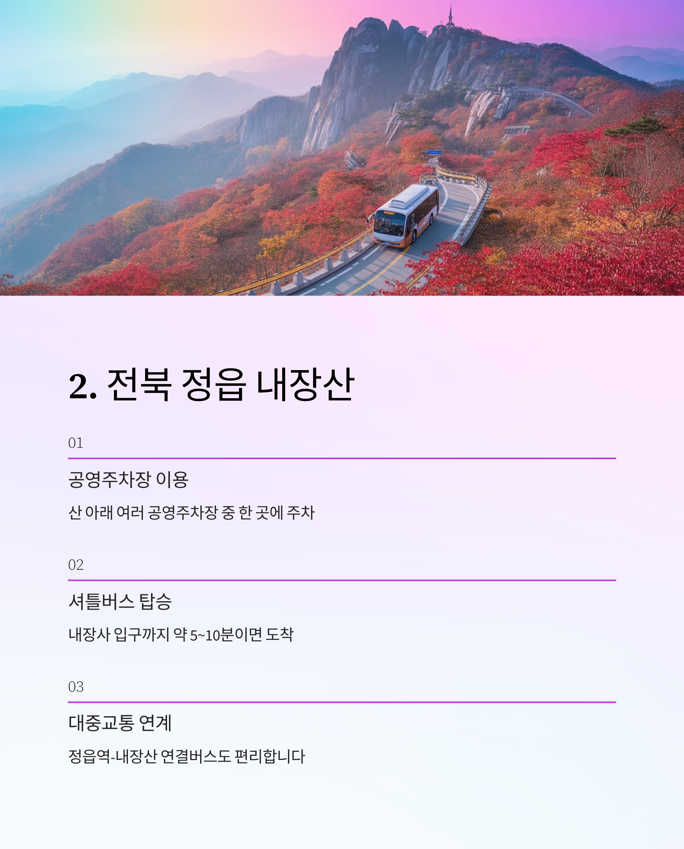 | 전북 정읍 | 내장산 | 공영주차장 + 셔틀버스 운영 | 대중교통 연계도 우수 |