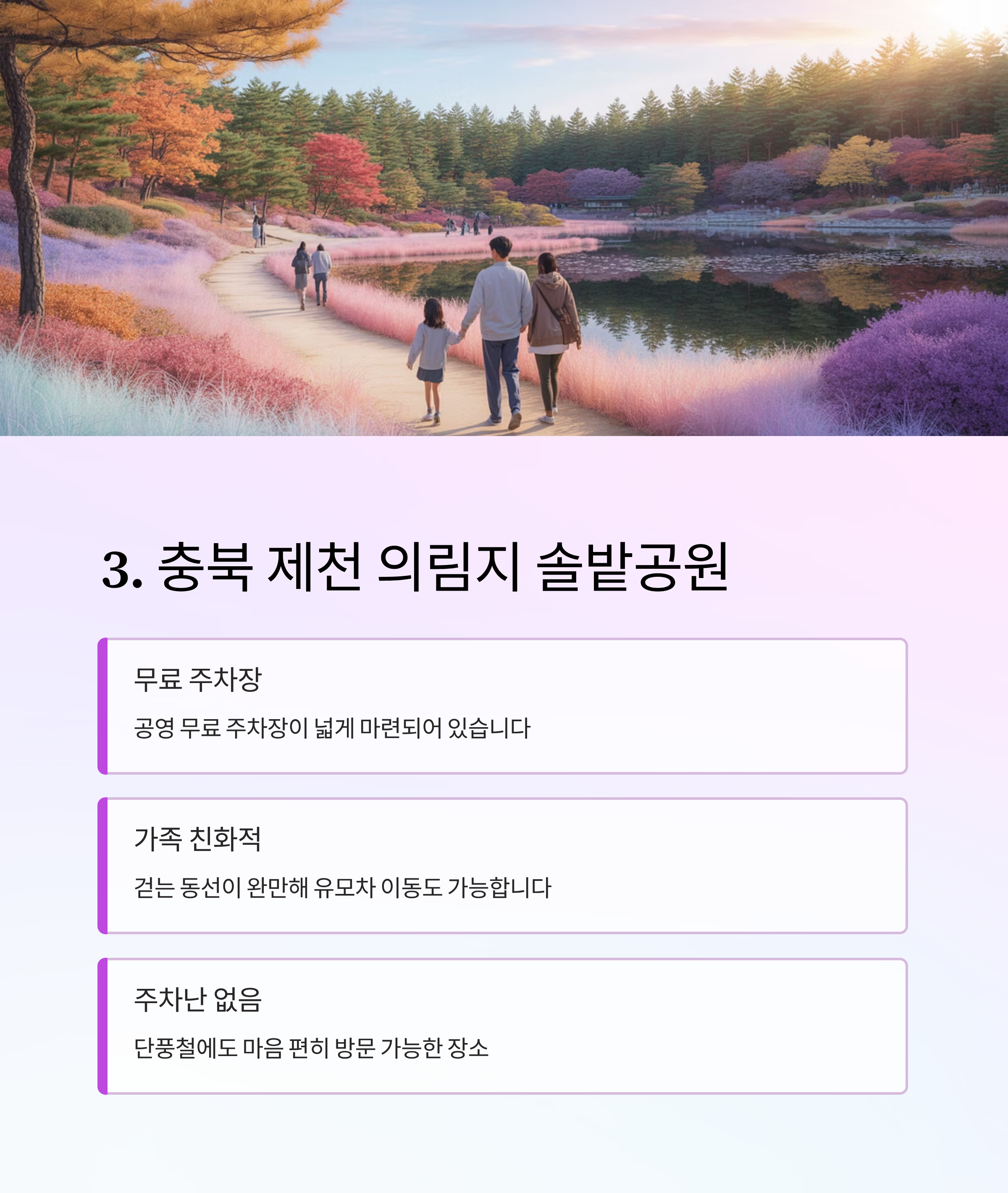 | 충북 제천 | 의림지 솔밭공원 | 무료 공영주차장, 여유로운 공간 | 가족 단위 산책에 적합 |
