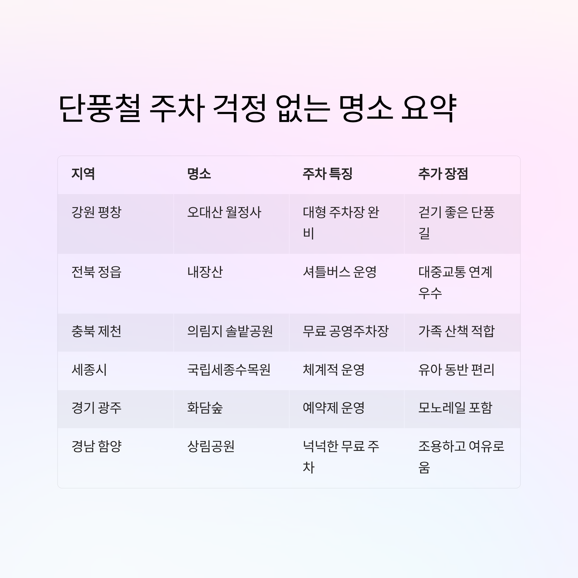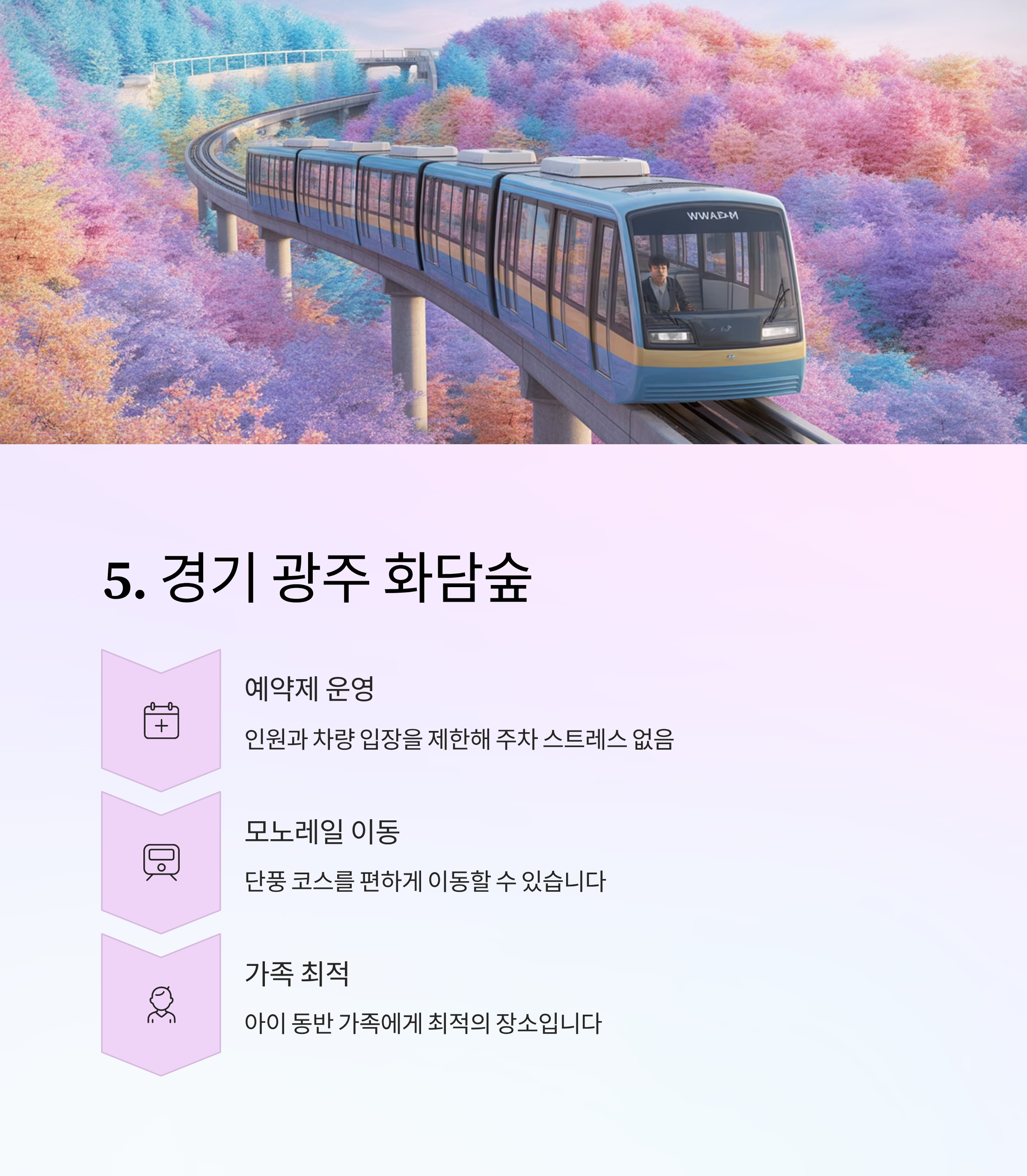 | 경기 광주 | 화담숲 | 예약제 운영으로 주차 혼잡 없음 | 모노레일 포함된 편한 코스 |