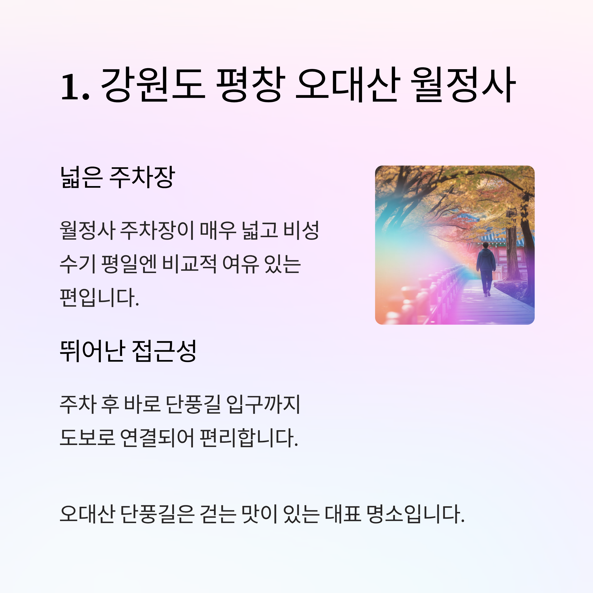 | 강원 평창 | 오대산 월정사 | 대형 주차장 완비, 입구와 가까움 | 걷기 좋은 단풍길 |