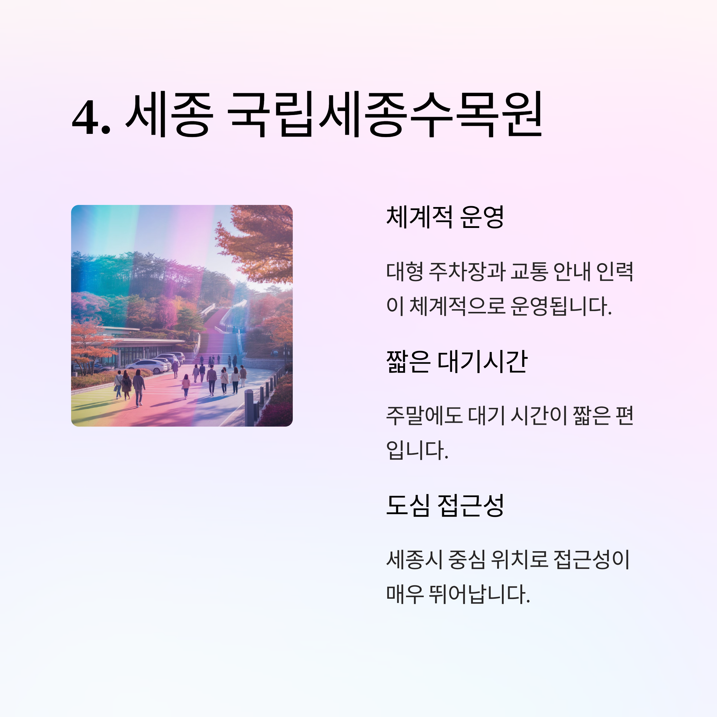 | 세종시 | 국립세종수목원 | 대형 주차장 + 체계적 운영 | 유아 동반 여행에 편리 |