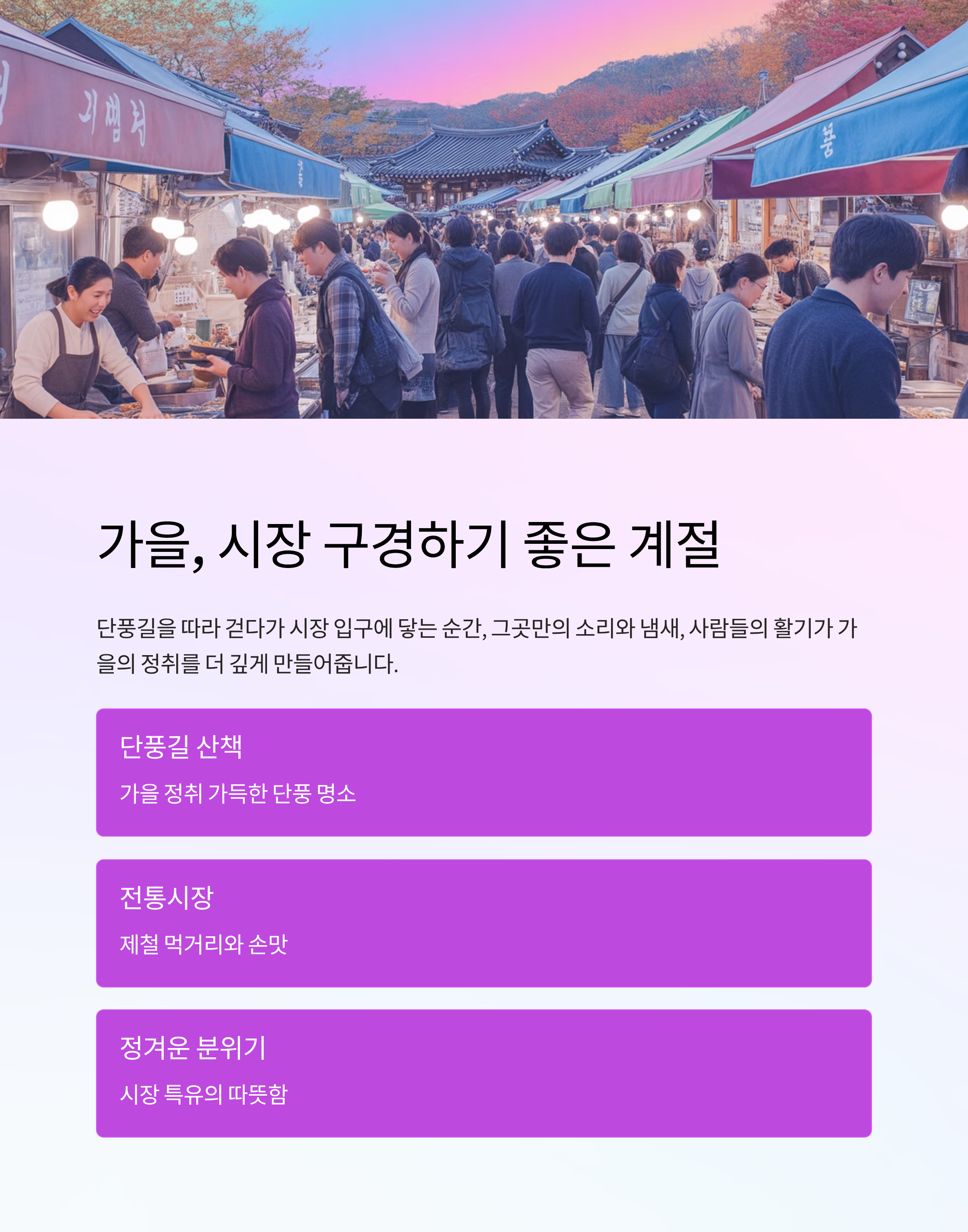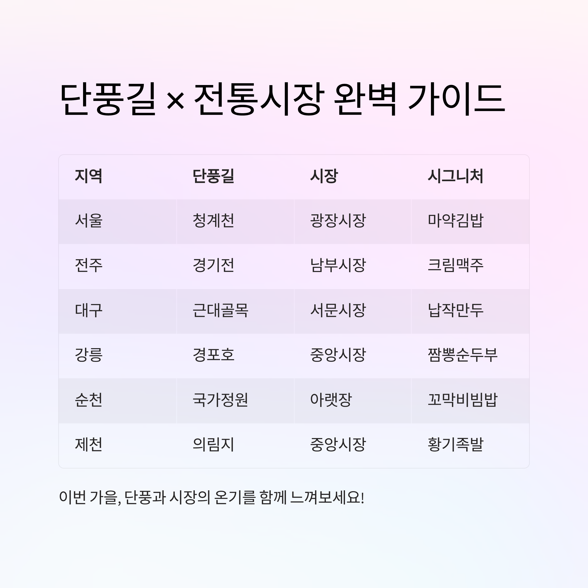 가을은 시장 구경하기 좋은 계절입니다. 단풍길을 따라 걷다가 시장 입구에 닿는 순간, 그곳만의 소리와 냄새, 사람들의 활기가 가을의 정취를 더 깊게 만들어주죠. 제철 먹거리와 손맛이 살아 있는 길거리 음식, 그리고 시장 특유의 정겨운 분위기까지. 오늘은 단풍길과 전통시장이 만나 더 풍성해지는, 걷고 먹고 구경까지 즐기는 ‘전통시장 나들이 코스’를 소개할게요.