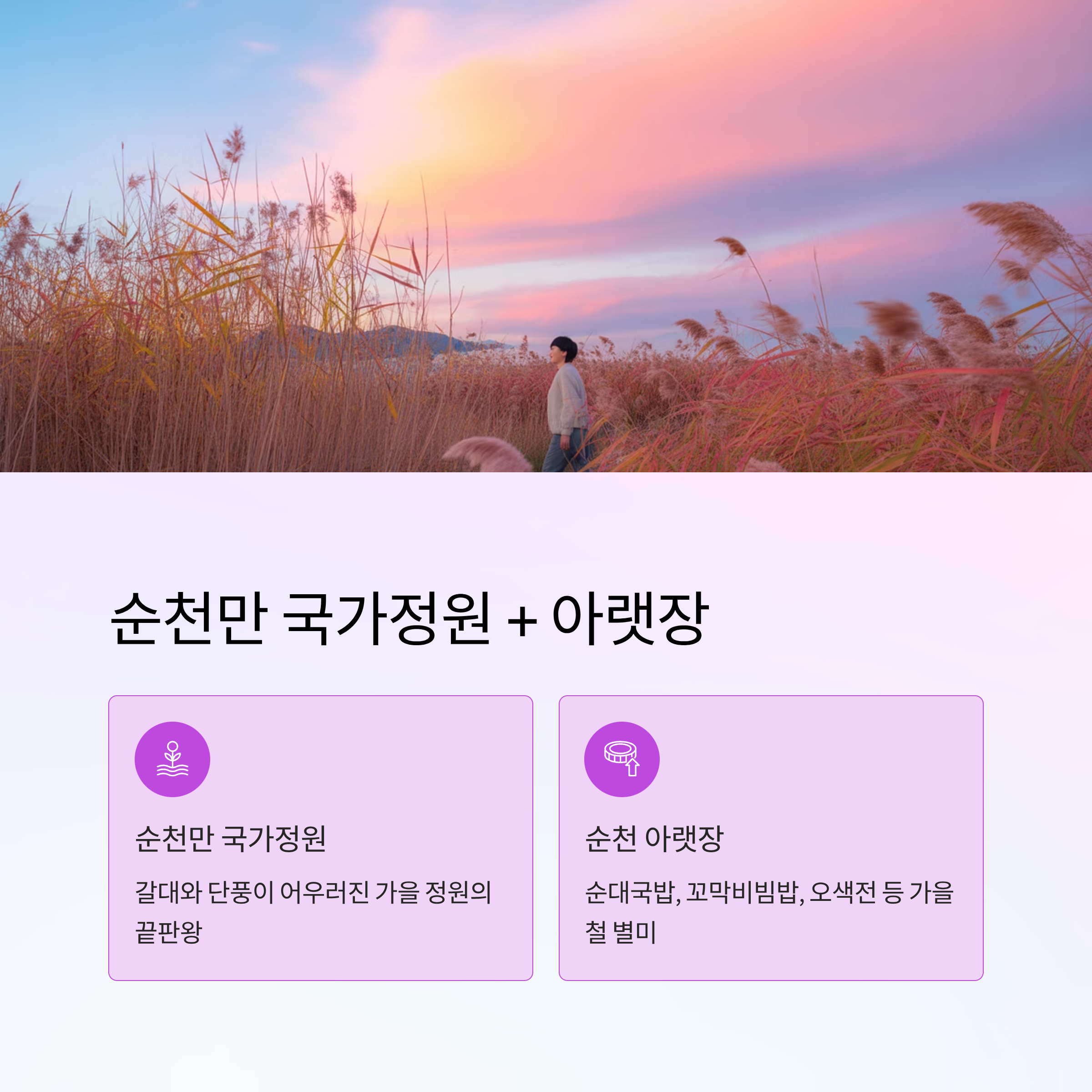 | 전남 순천 | 순천만 국가정원 | 순천 아랫장 | 꼬막비빔밥, 순대국밥 |