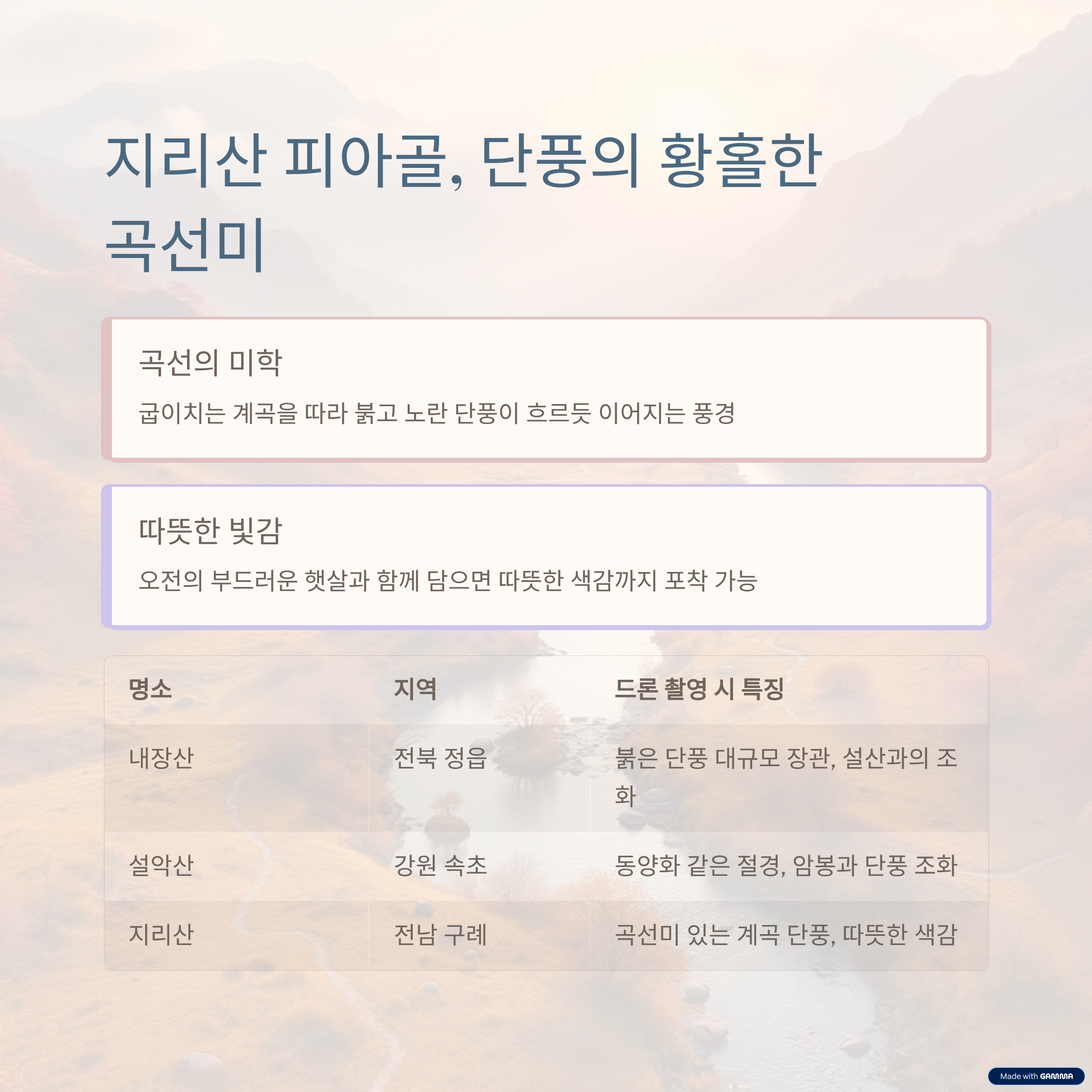 드론을 띄우면 피아골 계곡이 마치 붓으로 그린 듯한 곡선을 따라 물들어 있는 모습이 한눈에 담기는데요, 특히 오전의 부드러운 햇살과 함께 담으면 따뜻한 빛감까지 포착할 수 있어요.