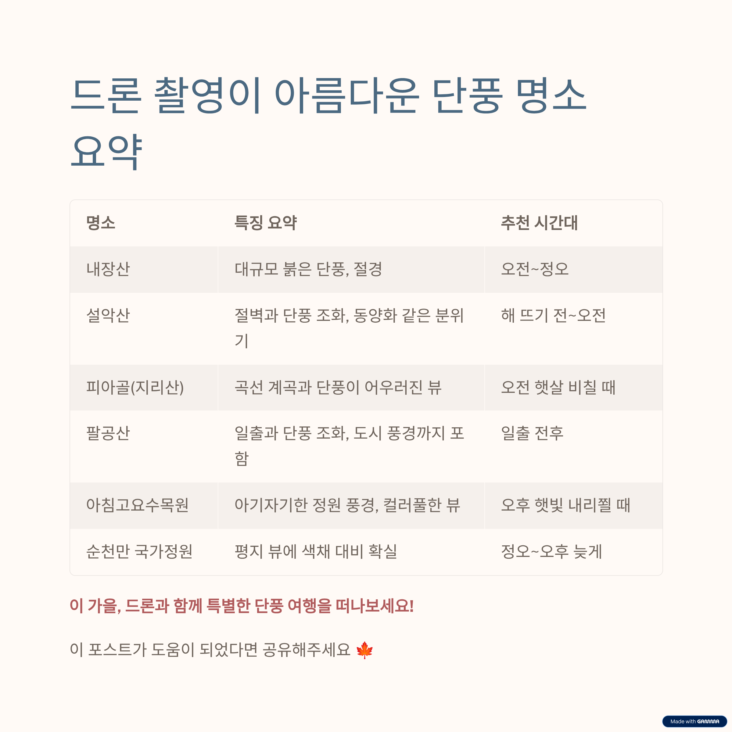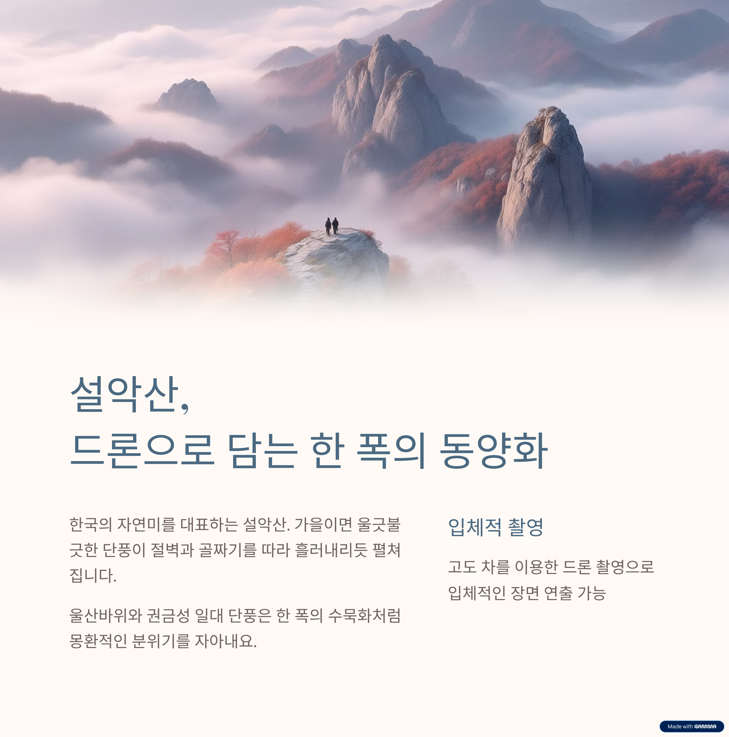 특히 공중에서 촬영할 경우, 울산바위와 권금성 일대 단풍은 한 폭의 수묵화처럼 몽환적인 분위기를 자아냅니다. 고도 차를 이용한 드론 촬영으로 입체적인 장면 연출이 가능한 곳이기도 해요.