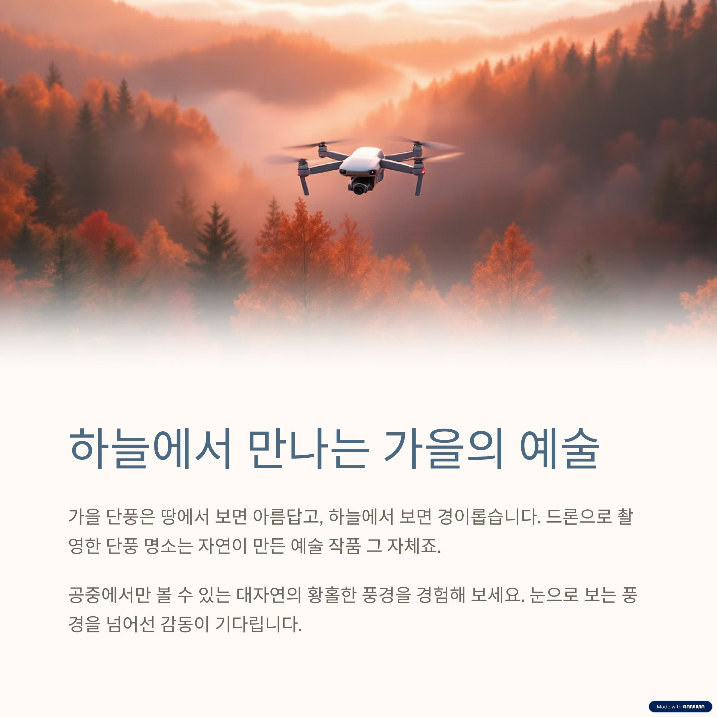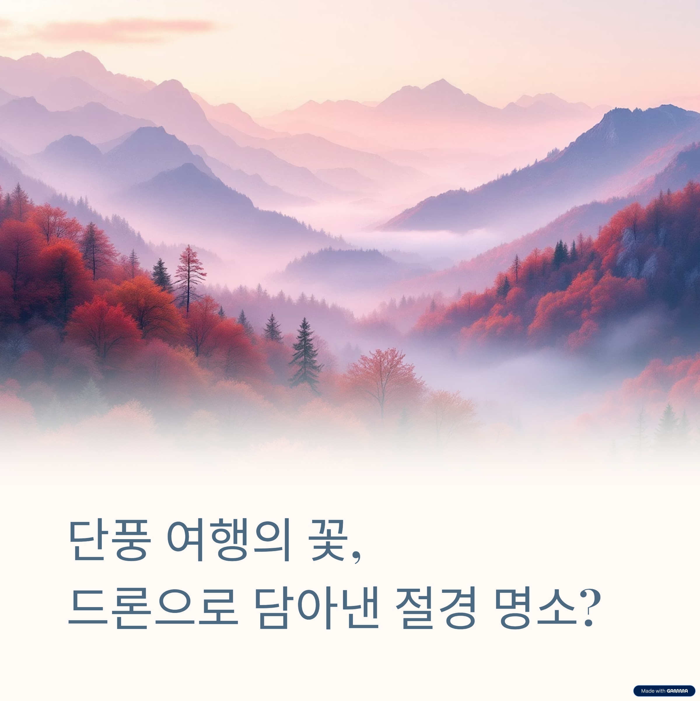 가을 단풍은 땅에서 보면 아름답고, 하늘에서 보면 경이롭습니다. 특히 드론으로 촬영한 단풍 명소는 자연이 만든 예술 작품 그 자체인데요. 이번 글에서는 드론으로 담아냈을 때 더욱 빛나는 국내 단풍 명소들을 소개합니다. 눈으로 보는 풍경을 넘어, 공중에서만 볼 수 있는 대자연의 황홀한 풍경을 경험해 보세요.