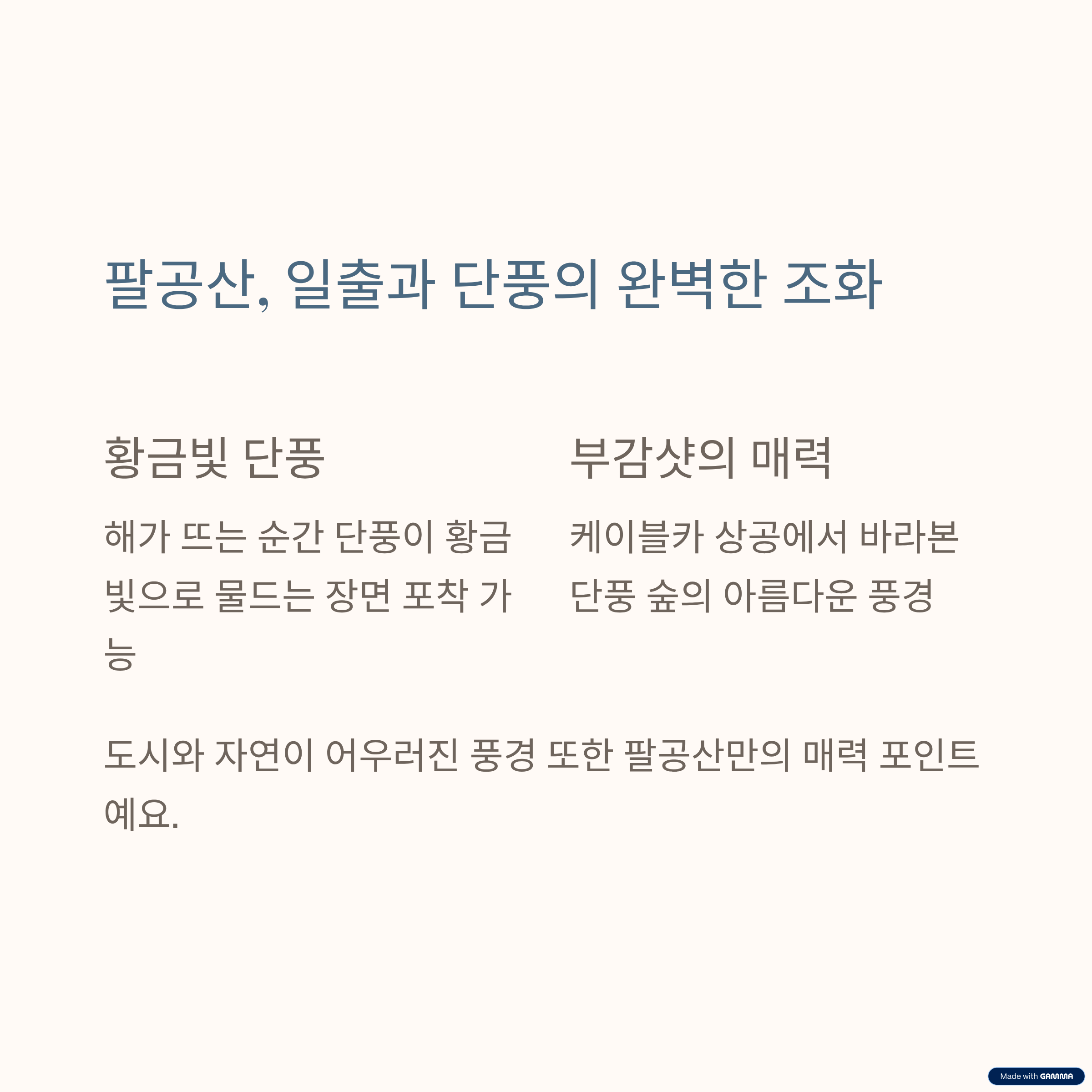 | 팔공산 | 일출과 단풍 조화, 도시 풍경까지 포함 | 일출 전후 |