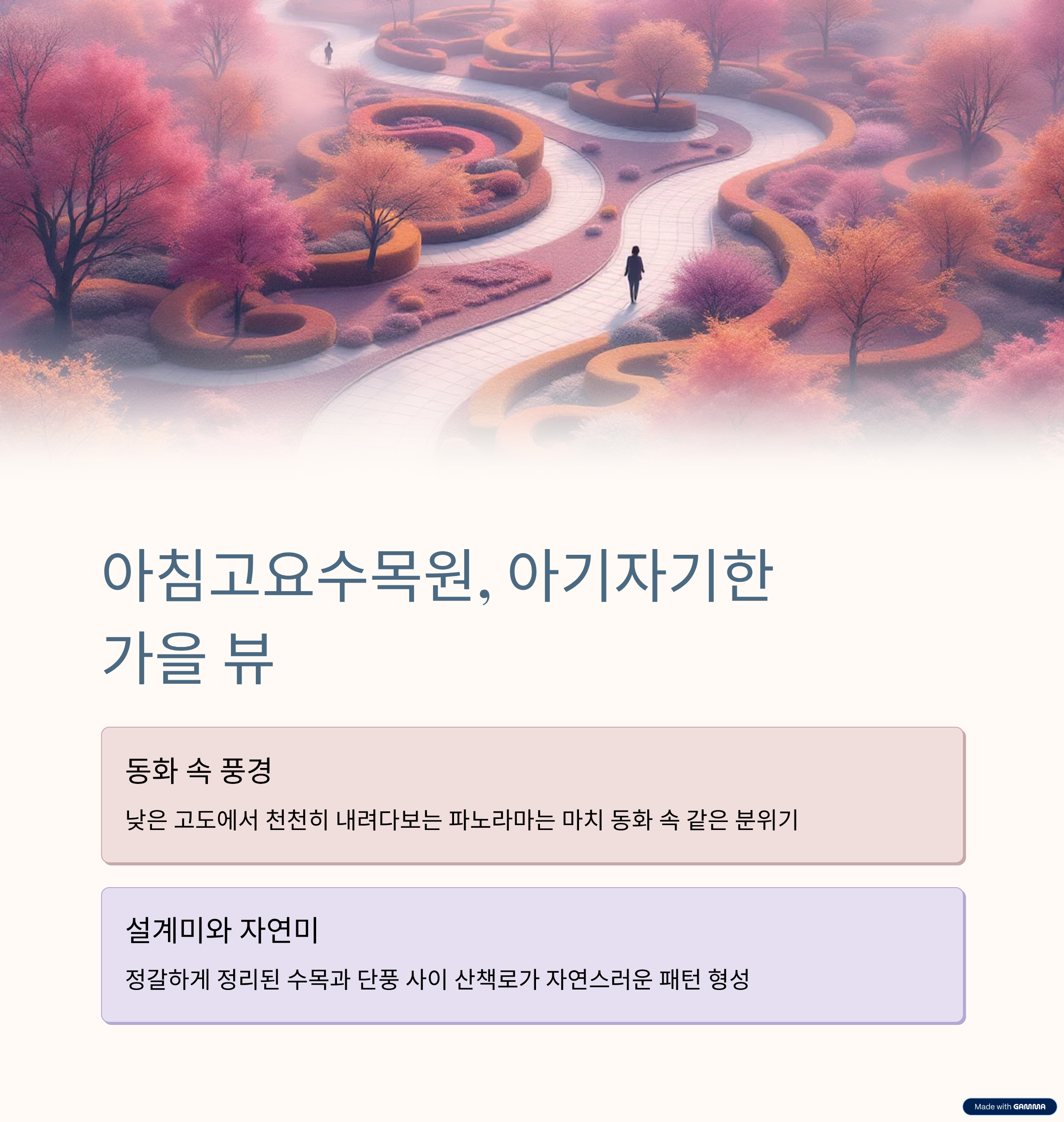 정갈하게 정리된 수목과 단풍 사이사이 산책로가 자연스러운 패턴을 만들어내며, 하늘에서 담으면 설계미와 자연미가 조화를 이룹니다.