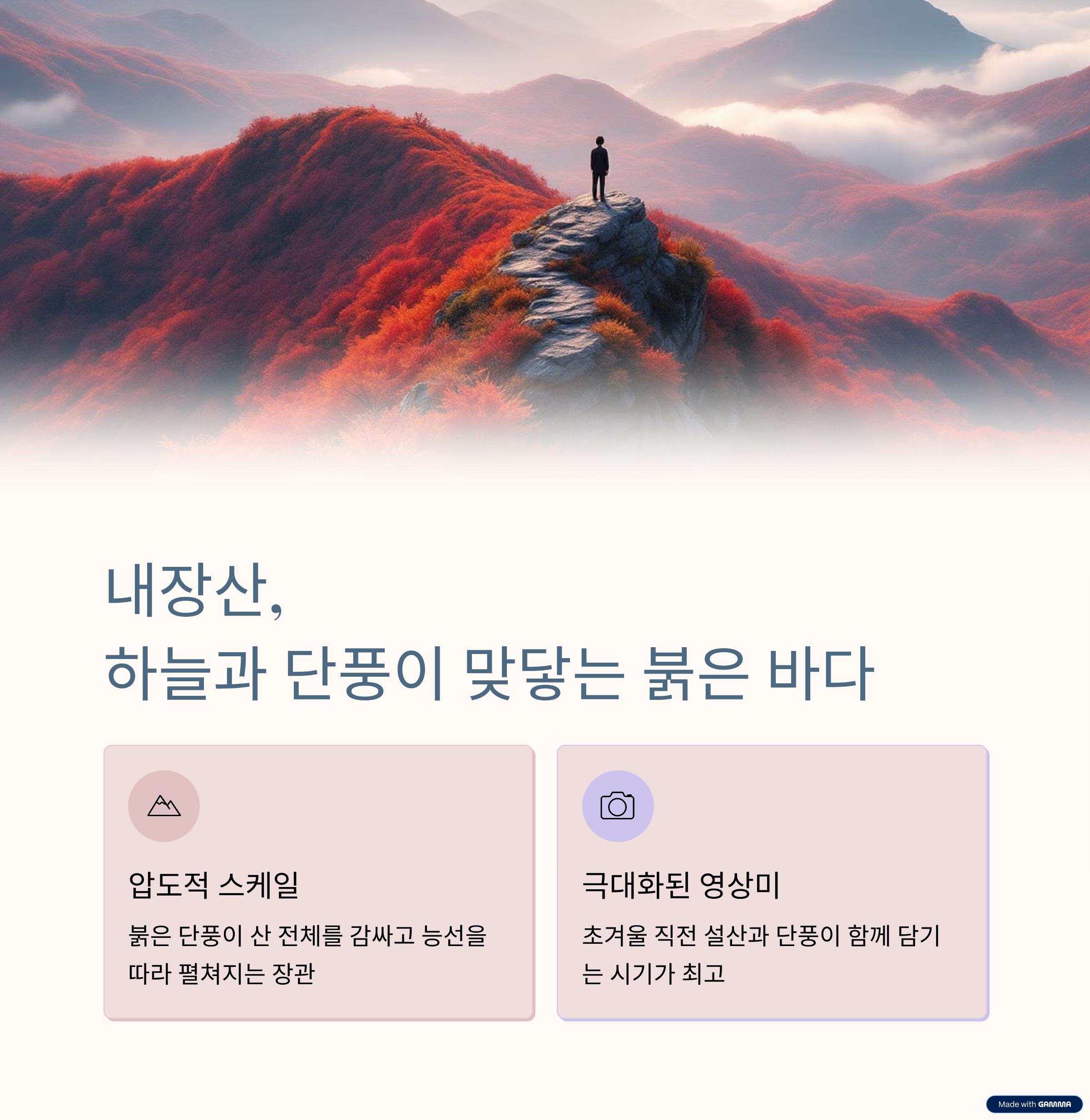 붉은 단풍이 산 전체를 감싸고, 능선을 따라 펼쳐지는 단풍 군락은 압도적인 스케일을 자랑해요. 특히 초겨울 직전, 설산과 단풍이 함께 담기는 시기는 영상미가 극대화됩니다.