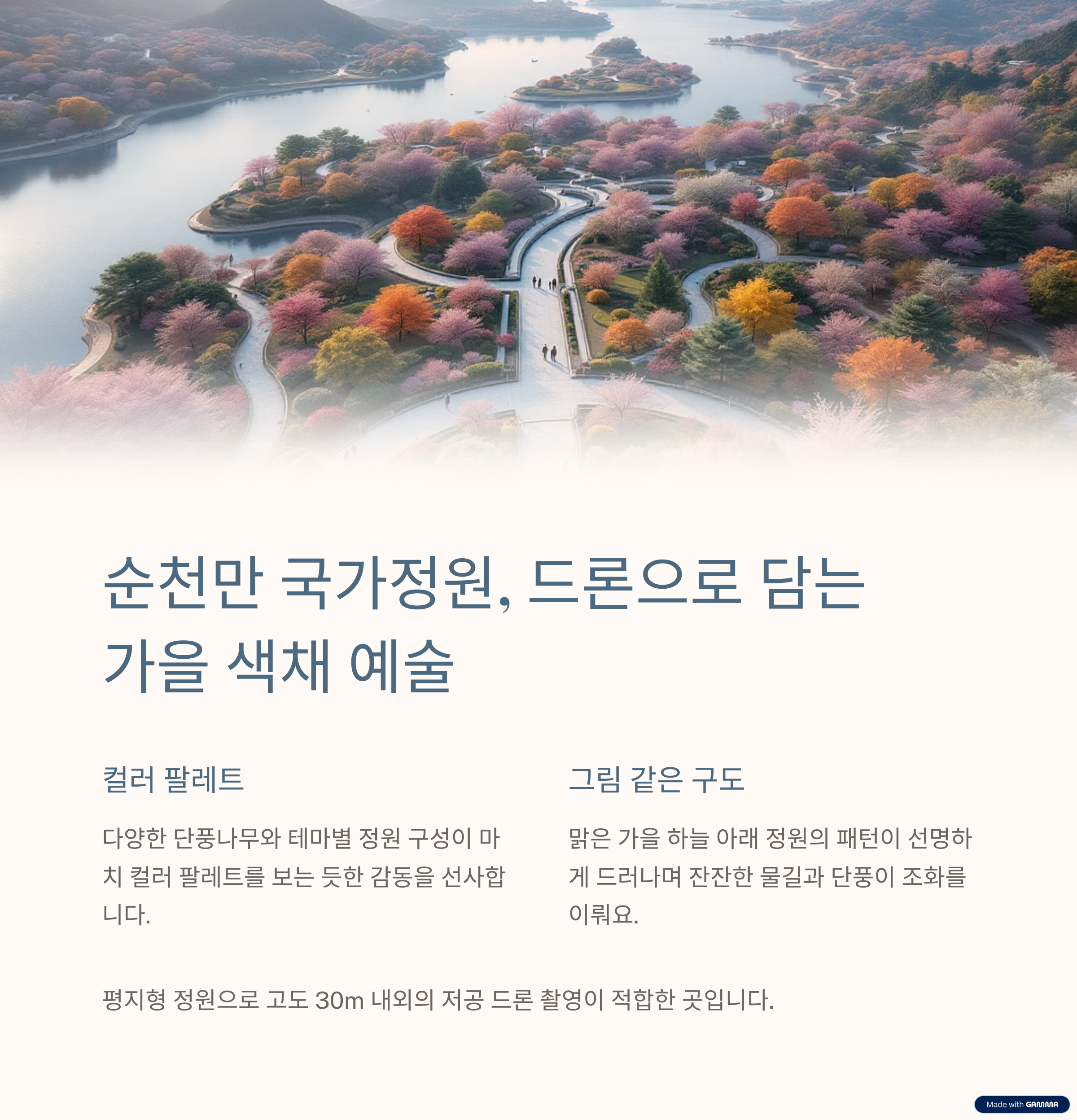평지형 정원으로 넓게 펼쳐진 순천만 국가정원은 고도 30m 내외의 저공 드론 촬영이 적합한 곳입니다. 다양한 단풍나무와 테마별 정원 구성은 마치 컬러 팔레트를 보는 듯한 감동을 줍니다.