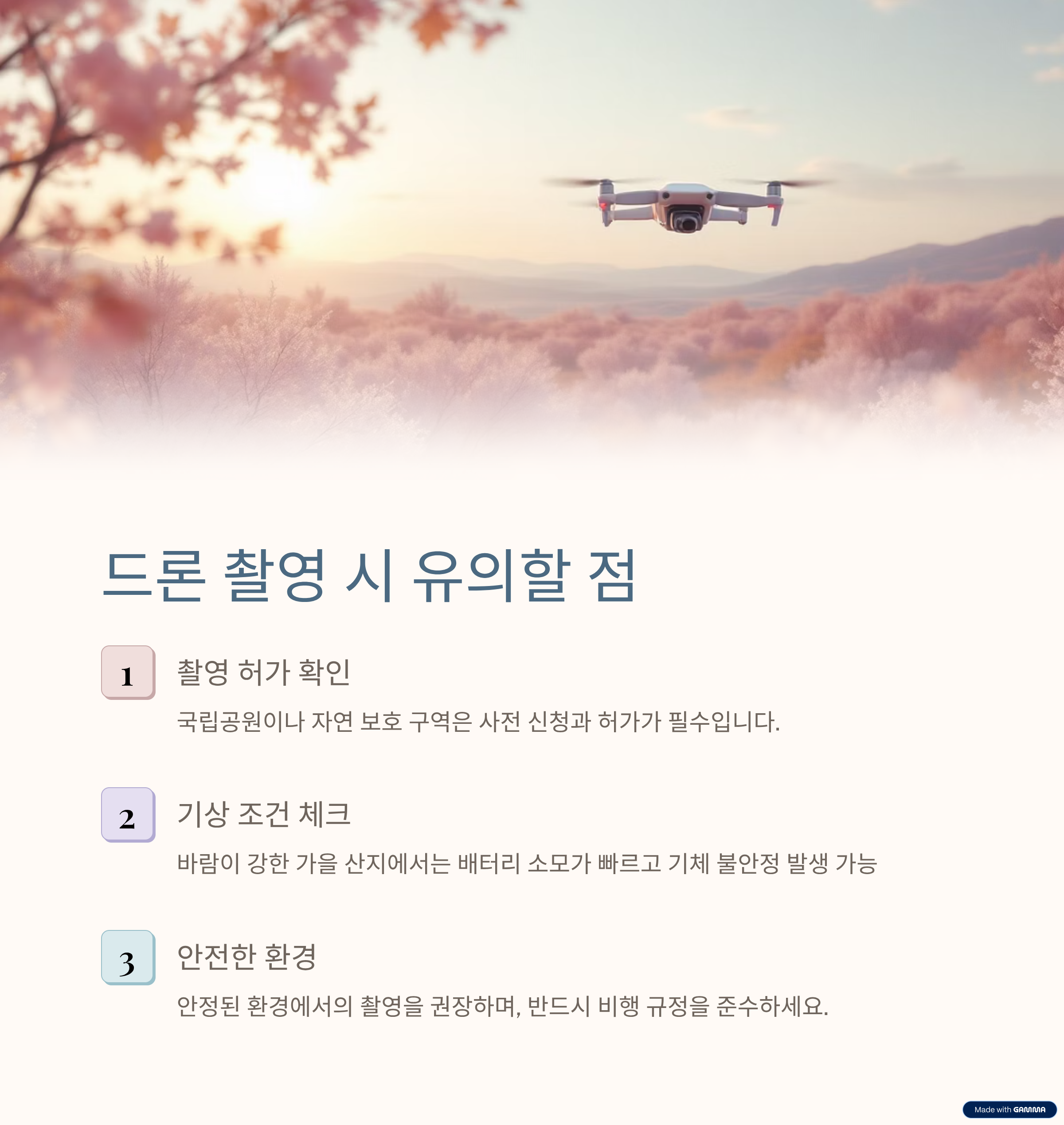 또한 바람이 강한 가을 산지에서는 배터리 소모가 빠르고 기체 불안정이 발생할 수 있으니, 안정된 환경에서의 촬영을 권장합니다.