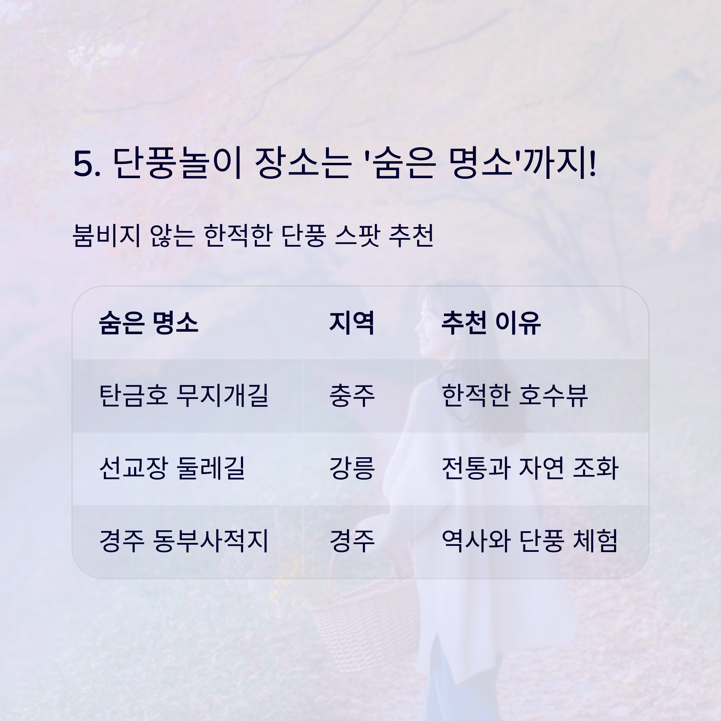 5. 단풍놀이 장소는 ‘숨은 명소’까지 고려!