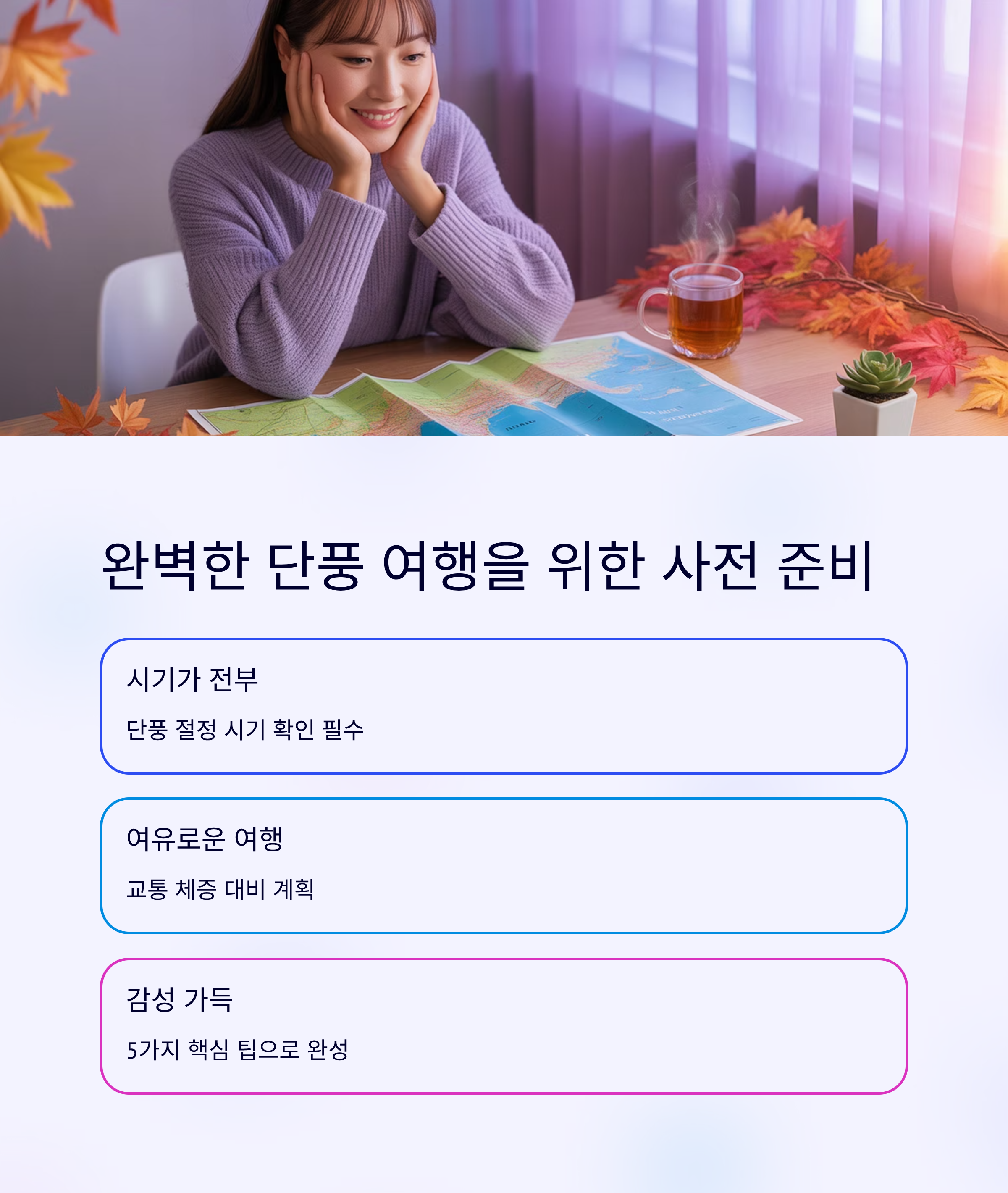 짧고 강렬한 단풍 시즌, 설렘 가득한 가을 여행을 떠나기 전 준비는 잘 되어 있으신가요? 예쁘게 물든 단풍을 제대로 즐기려면 단순한 여행 일정만 짜는 것으로는 부족하답니다. 오늘은 단풍 여행을 떠나기 전에 꼭 알아야 할 핵심 팁 5가지를 정리해봤어요. 이 다섯 가지만 기억하면, 피곤한 여행 대신 여유 있고 감성 가득한 단풍 여행을 즐길 수 있습니다!