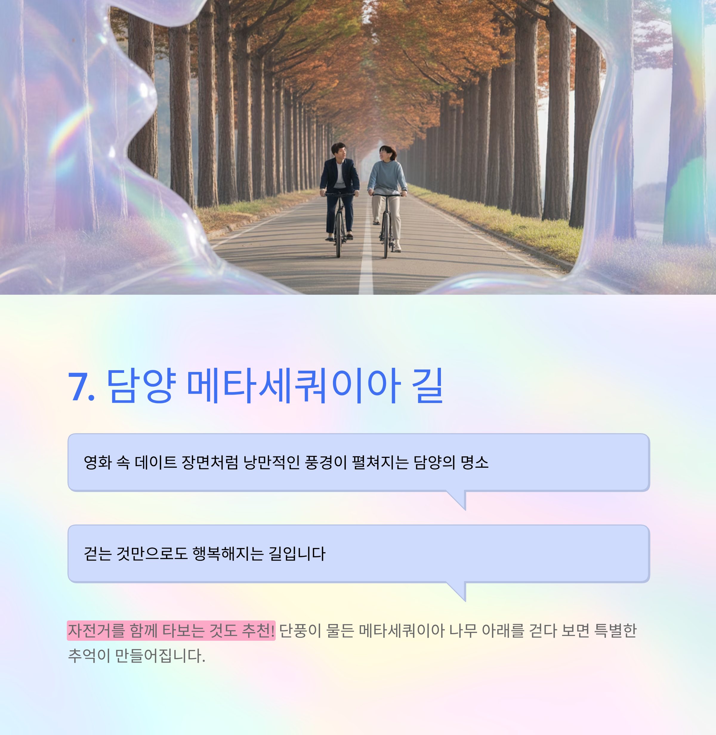 영화 속 데이트 장면처럼 낭만적인 풍경이 펼쳐지는 담양의 명소. 단풍이 물든 메타세쿼이아 나무 아래를 걷다 보면, 걷는 것만으로도 행복해지는 길입니다. 자전거를 함께 타보는 것도 추천!