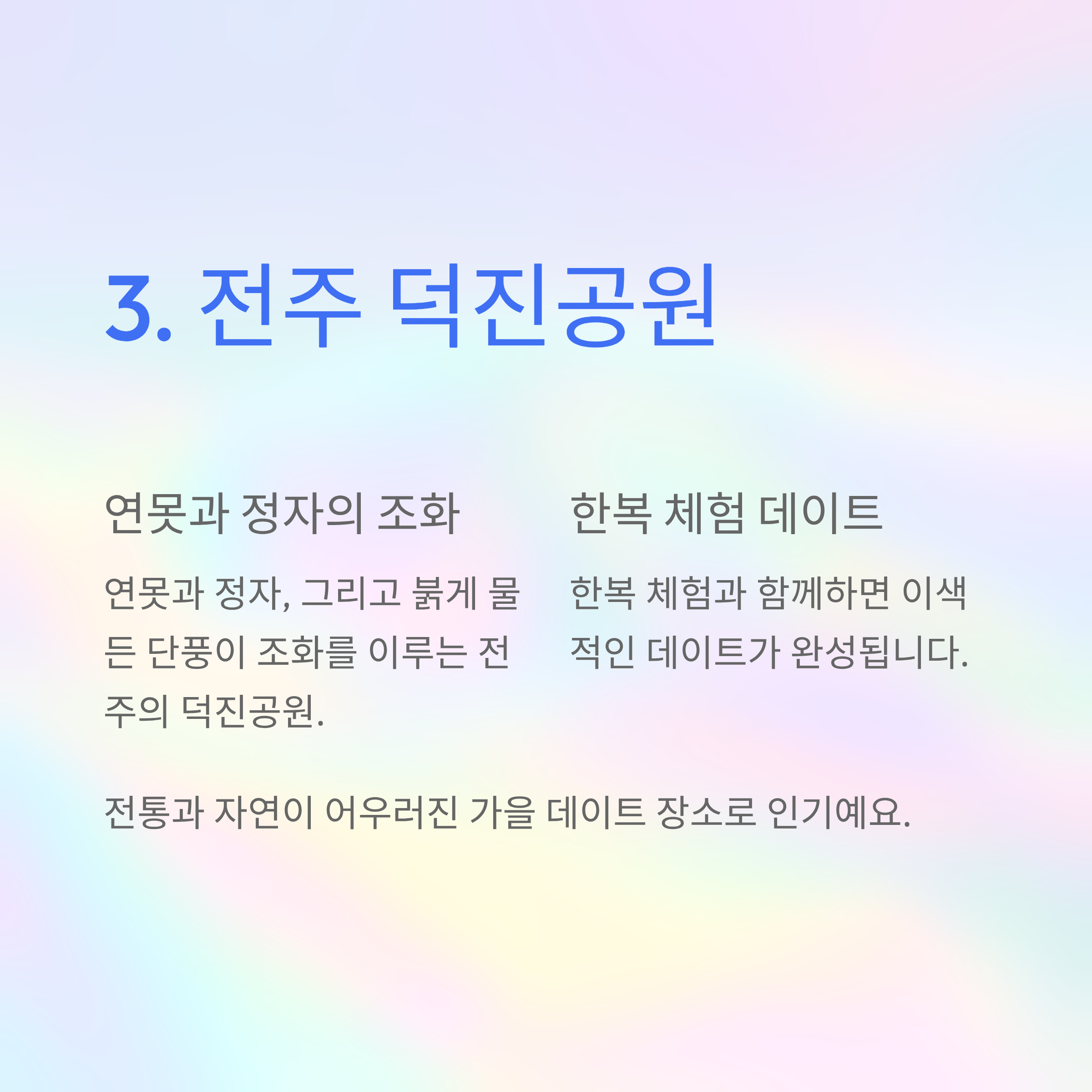 연못과 정자, 그리고 붉게 물든 단풍이 조화를 이루는 전주의 덕진공원. 한복 체험과 함께하면 이색적인 데이트가 완성됩니다. 전통과 자연이 어우러진 가을 데이트 장소로 인기예요.