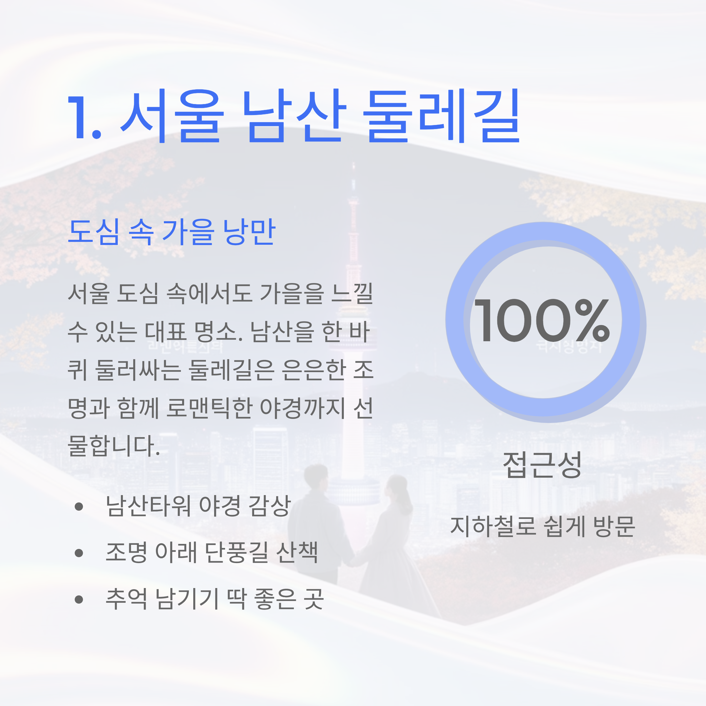 서울 도심 속에서도 가을을 느낄 수 있는 대표 명소. 남산을 한 바퀴 둘러싸는 둘레길은 은은한 조명과 함께 로맨틱한 야경까지 선물합니다. 남산타워까지 산책하며 추억을 남기기 딱 좋아요.