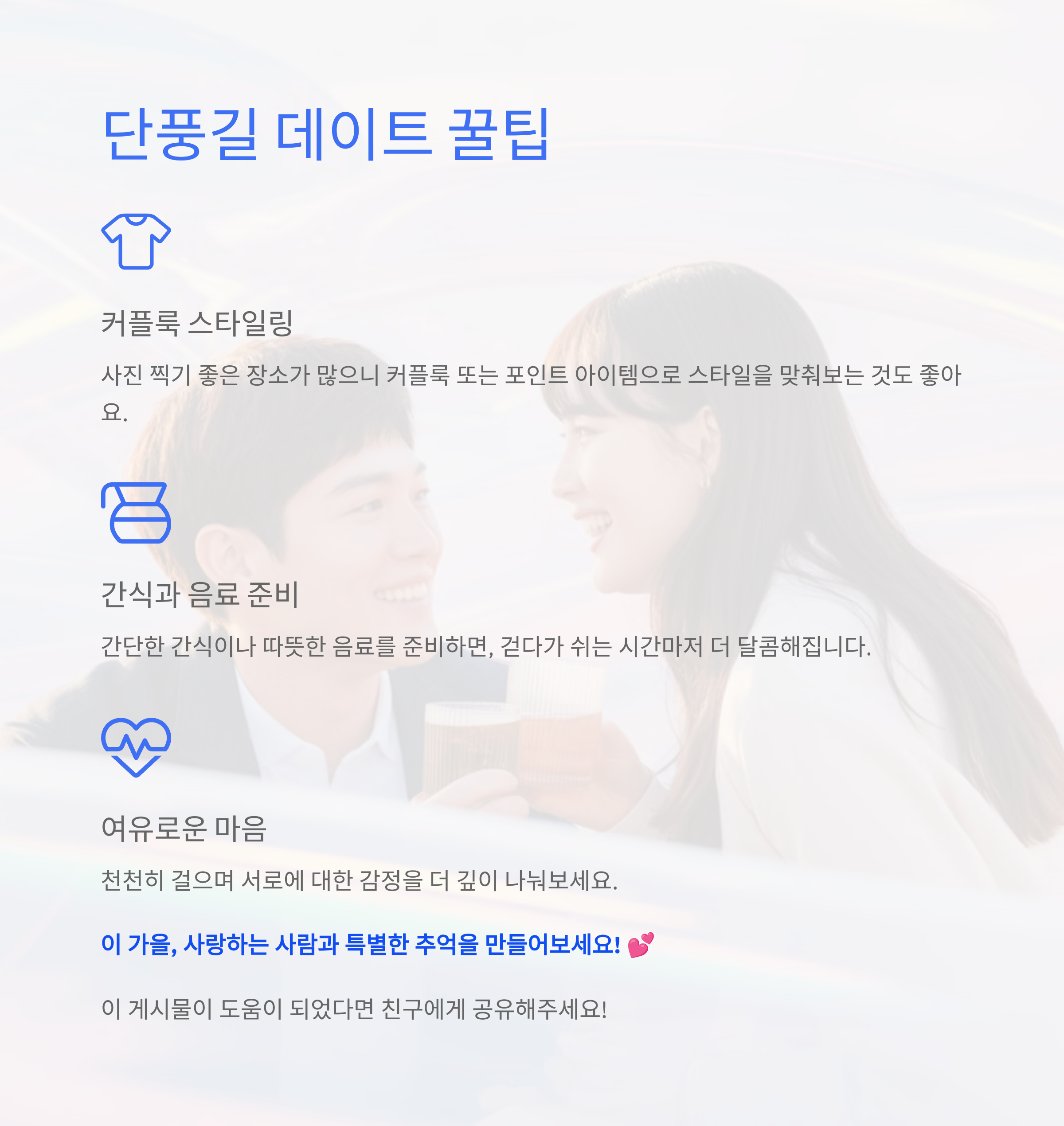 또한 간단한 간식이나 따뜻한 음료를 준비하면, 걷다가 쉬는 시간마저 더 달콤해집니다. 여유 있는 마음으로 천천히 걸으며 서로에 대한 감정을 더 깊이 나눠보세요.