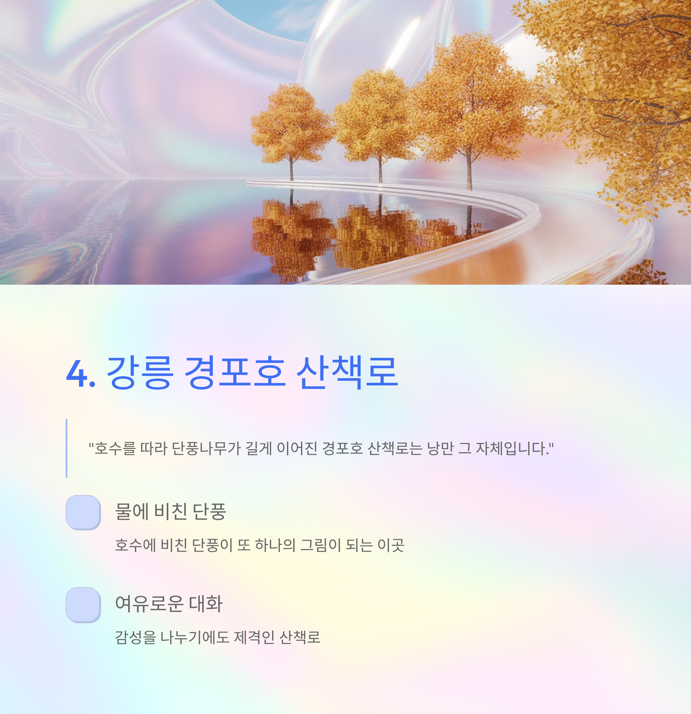 호수를 따라 단풍나무가 길게 이어진 경포호 산책로는 낭만 그 자체입니다. 물에 비친 단풍이 또 하나의 그림이 되는 이곳, 여유로운 대화와 감성을 나누기에도 제격이죠.