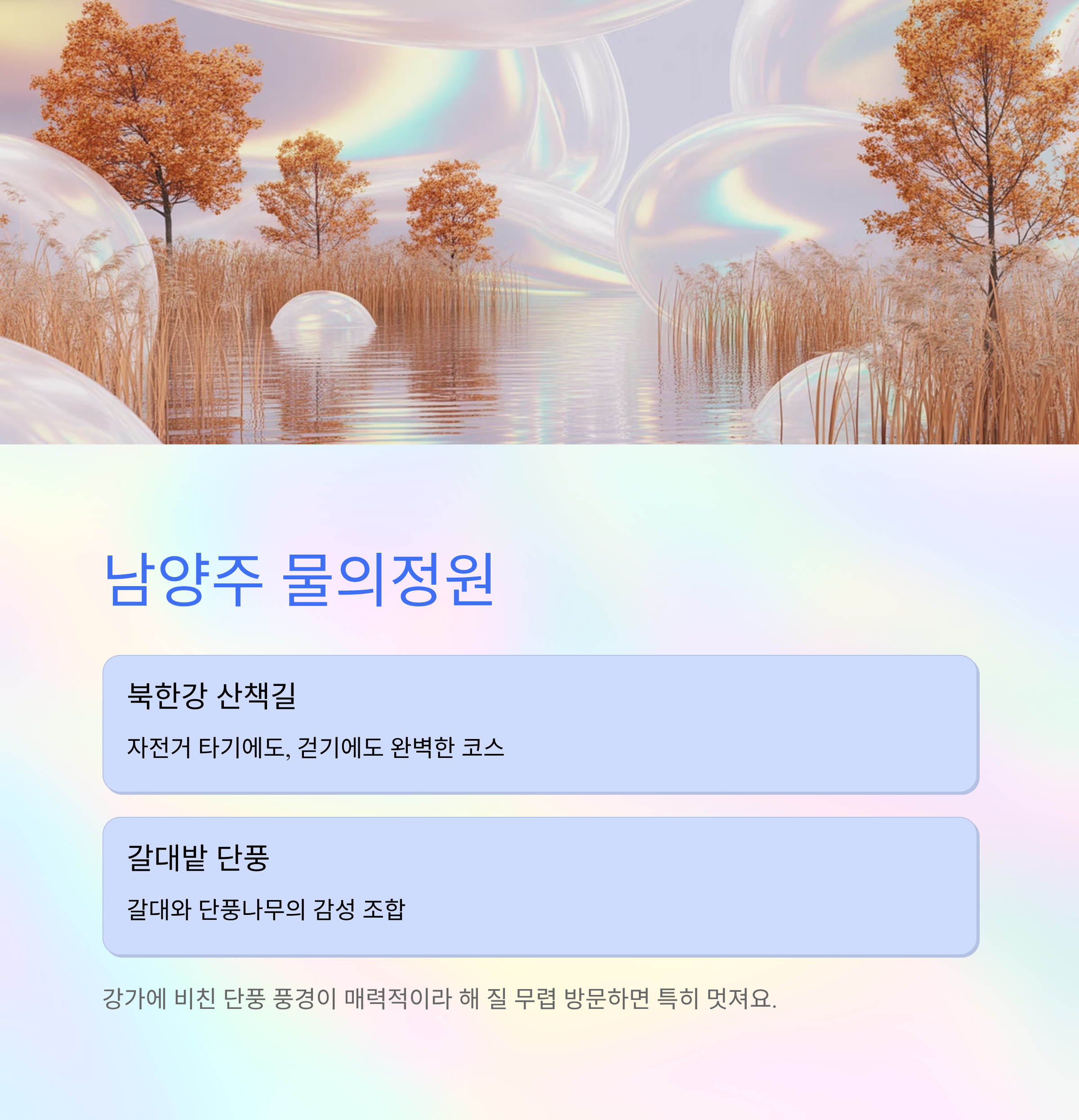 | 경기 남양주 | 물의정원 | 강변 단풍+갈대 | 약 1시간 |