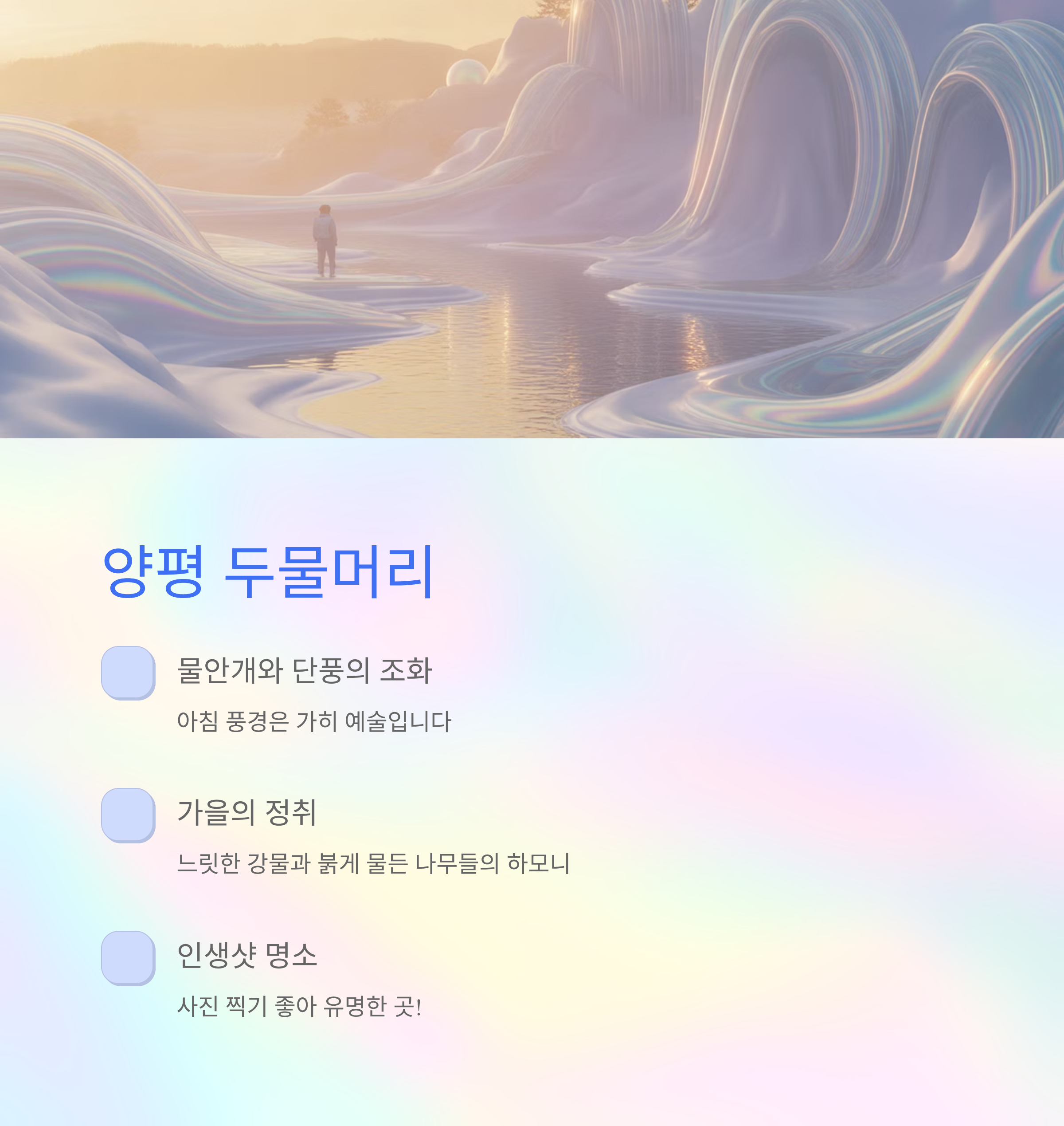 | 경기 양평 | 두물머리 | 물안개+단풍 | 약 1시간 10분 |