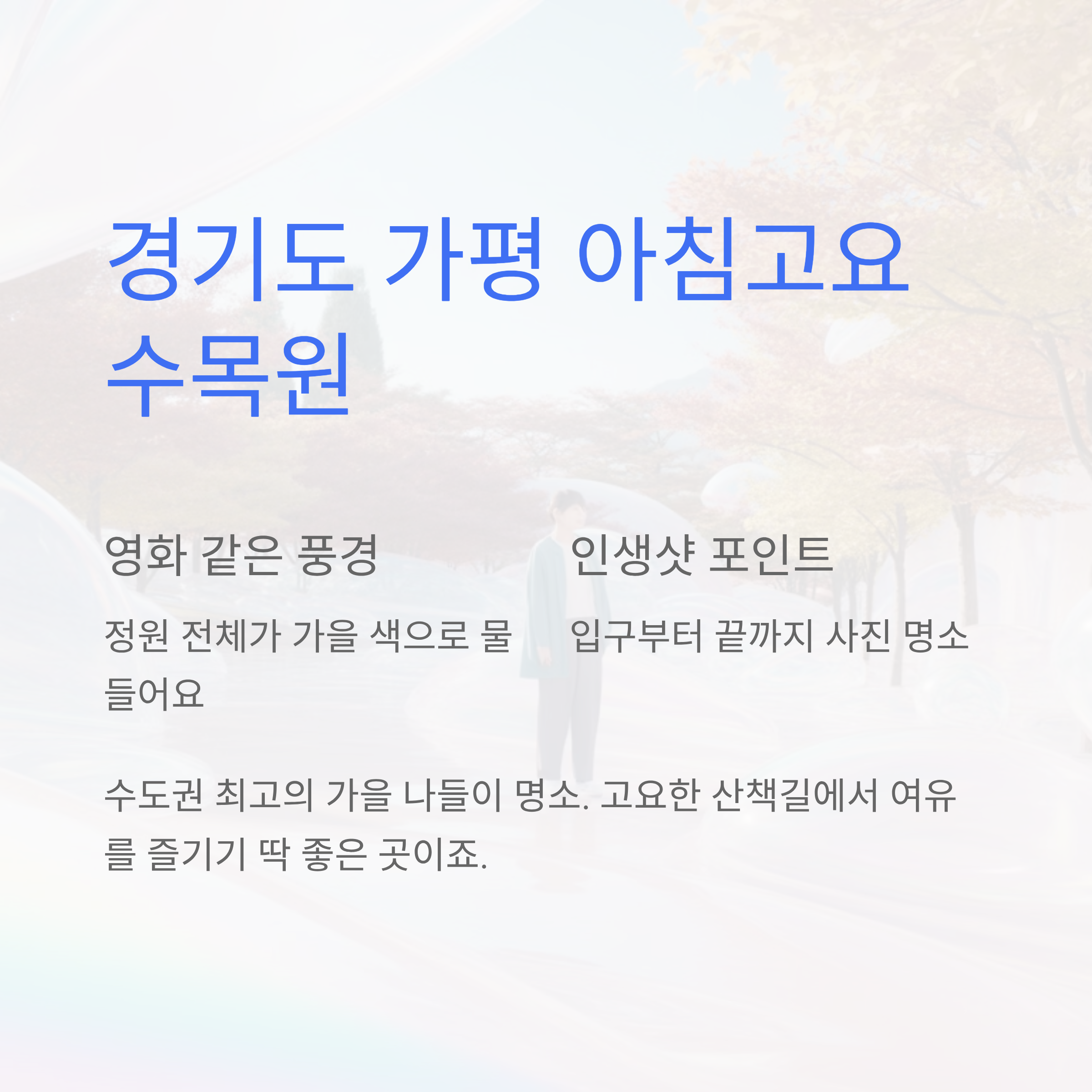 수도권 최고의 가을 나들이 명소 중 하나. 단풍뿐 아니라 정원 전체가 가을 색으로 물들어 영화 같은 풍경을 자랑합니다. 고요한 산책길, 한적한 정원길에서 여유를 즐기기에 딱 좋은 곳이죠.