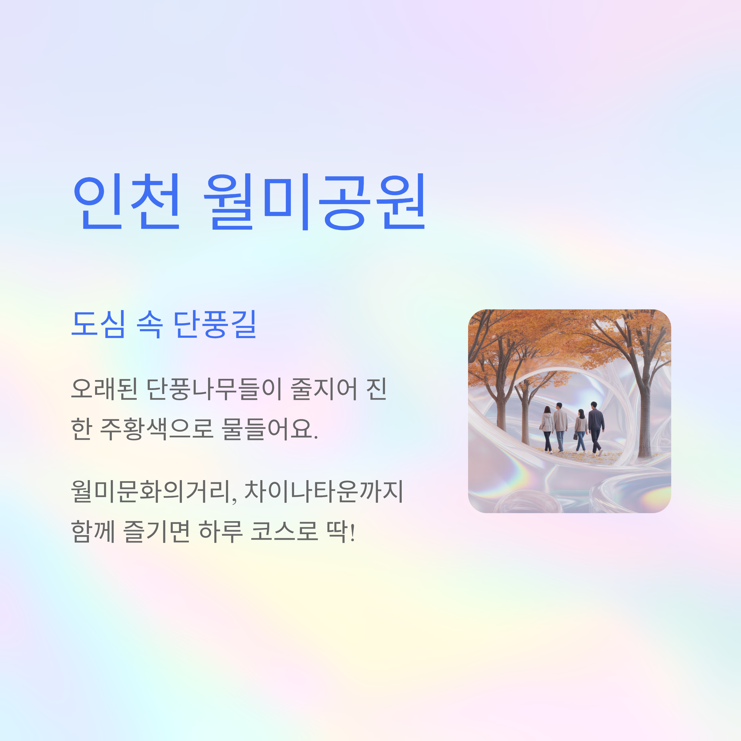 | 인천 | 월미공원 | 도심 속 단풍길 | 약 1시간 |