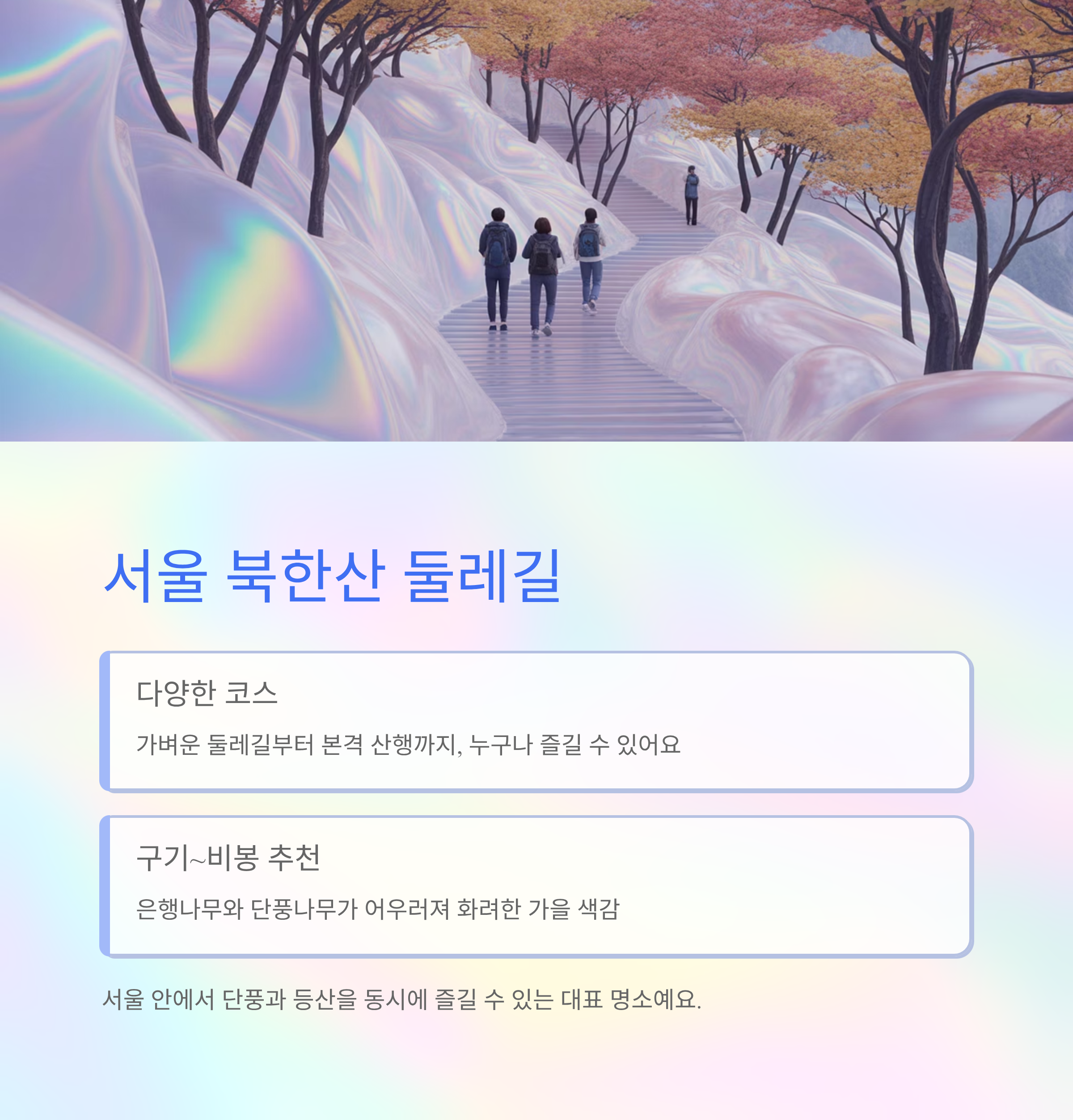 | 서울 | 북한산 둘레길 | 산책+등산 단풍 코스 | 약 30분 |