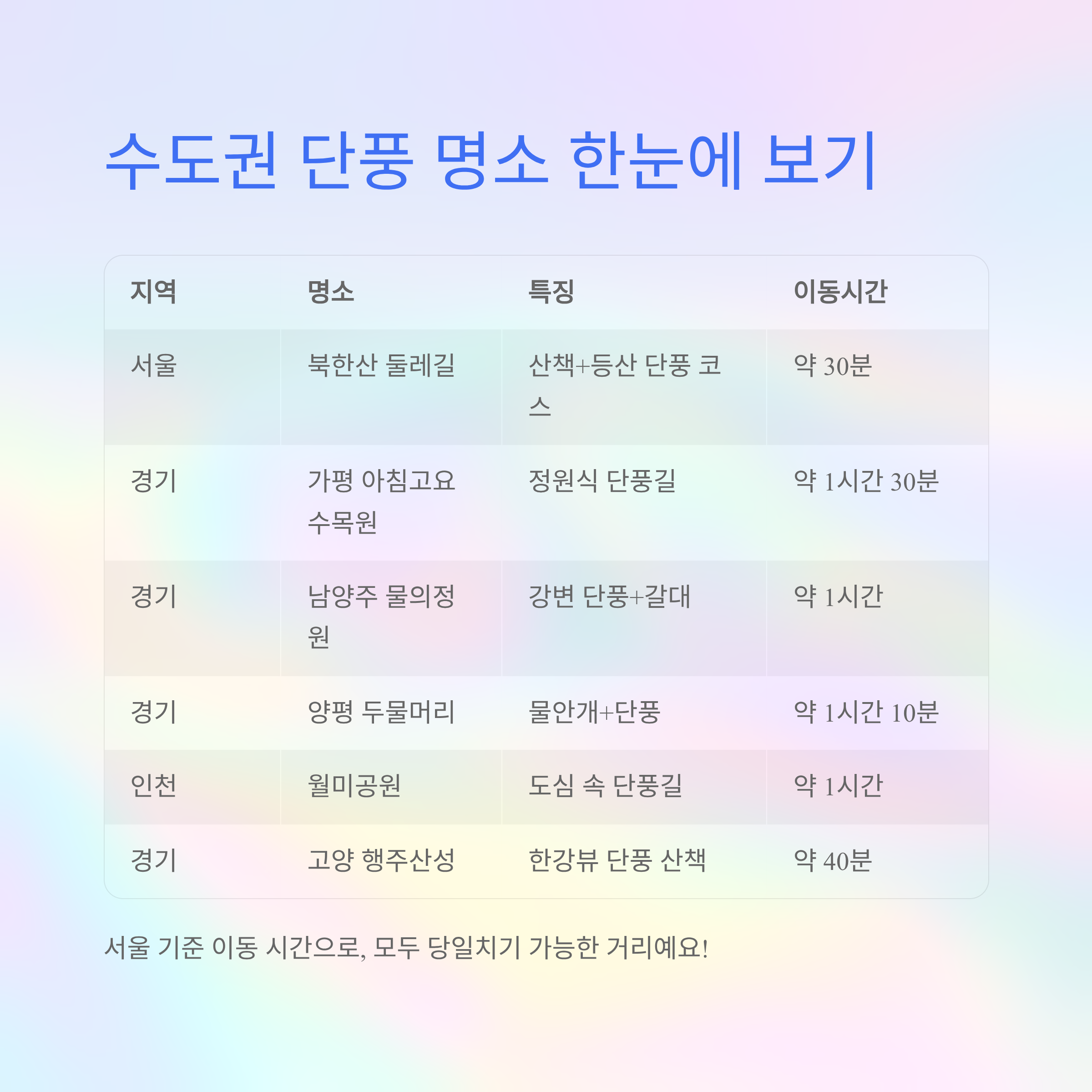 가을이면 멀리 떠나야 단풍을 볼 수 있을 거라 생각하셨다면, 오산이에요! 수도권 근교에도 풍경 좋은 단풍 명소가 정말 많습니다. 주말 당일치기나 반나절 데이트 코스로도 딱 좋은 서울 및 수도권 인근의 단풍 명소들을 한눈에 정리해드릴게요. 자연도 보고, 걷기 좋은 길도 많고, 사진 맛집도 넘쳐나는 곳들이에요.