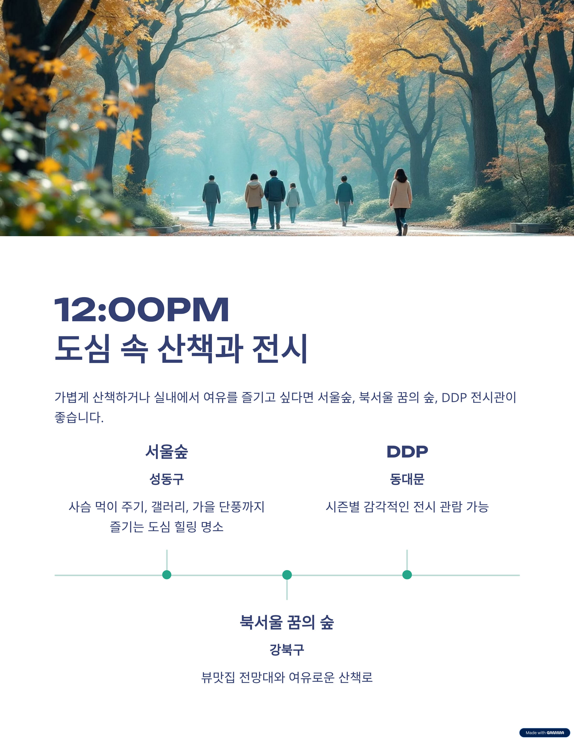 ‘서울숲’, ‘북서울 꿈의 숲’, ‘DDP 전시관’ 같은 공간이 좋습니다.