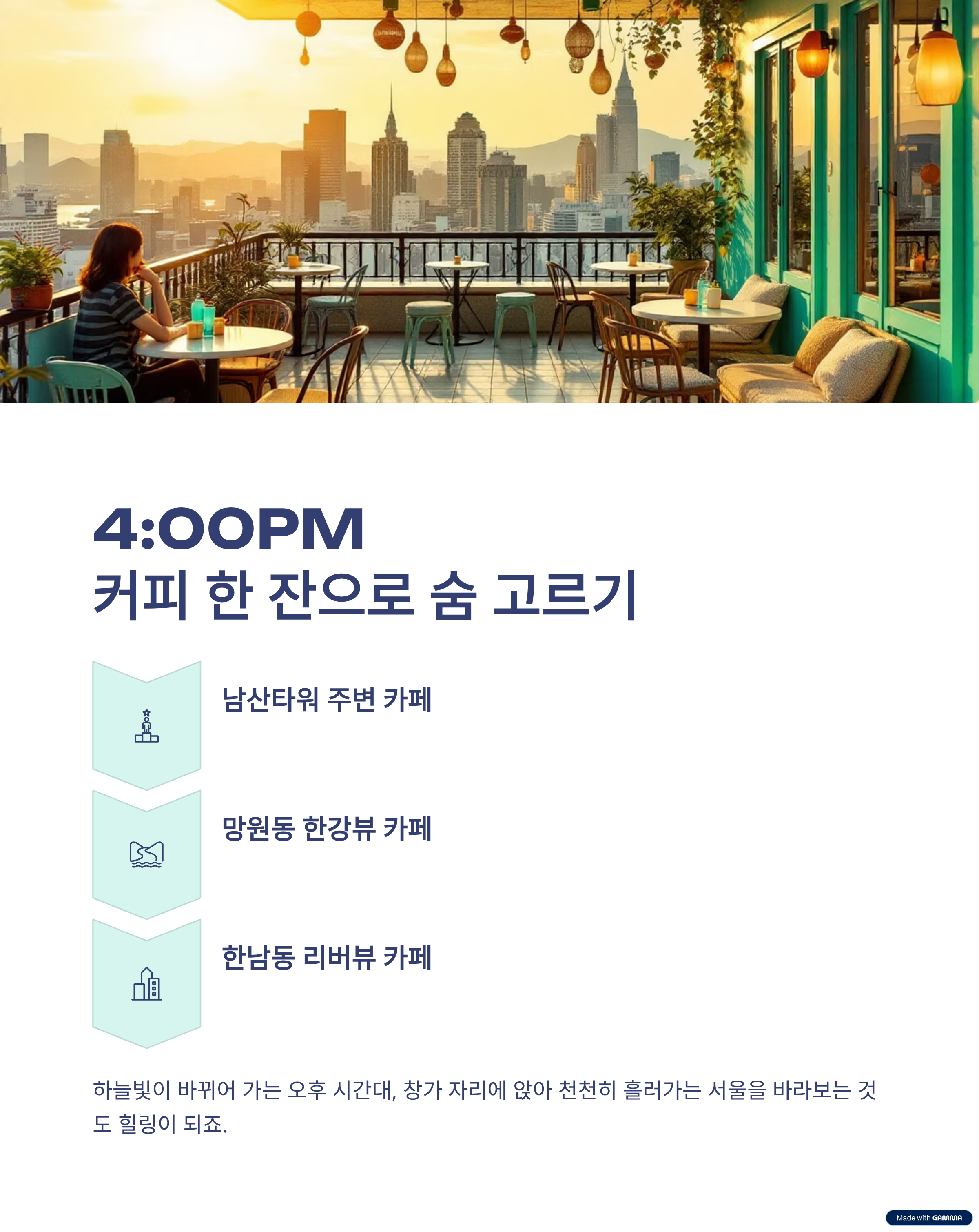 하루의 중간쯤엔 잠시 쉬어가야죠. 분위기 좋은 루프탑이나 전망 좋은 카페를 찾아보세요.