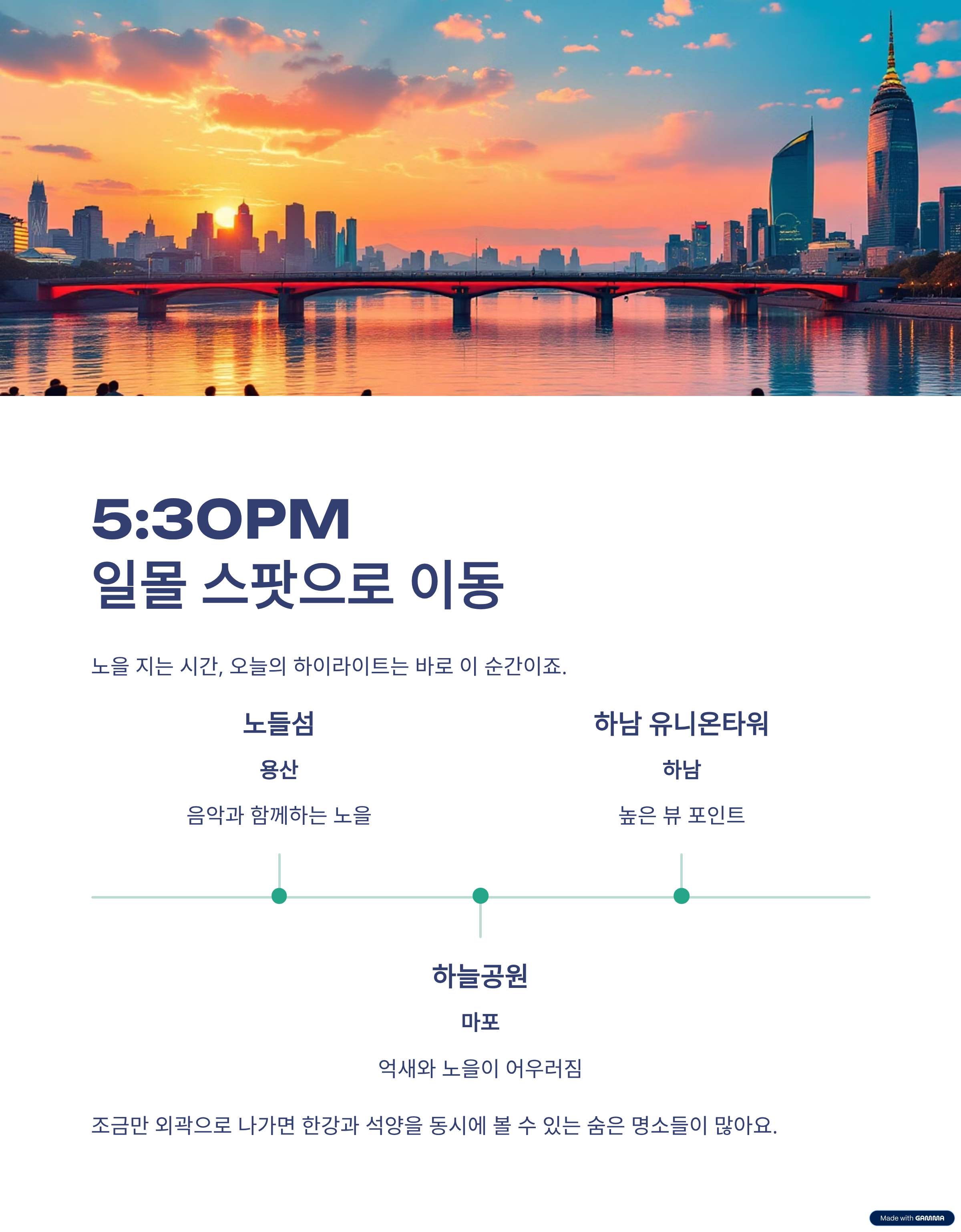 | 17:30 | 노들섬 | 일몰 감상 |