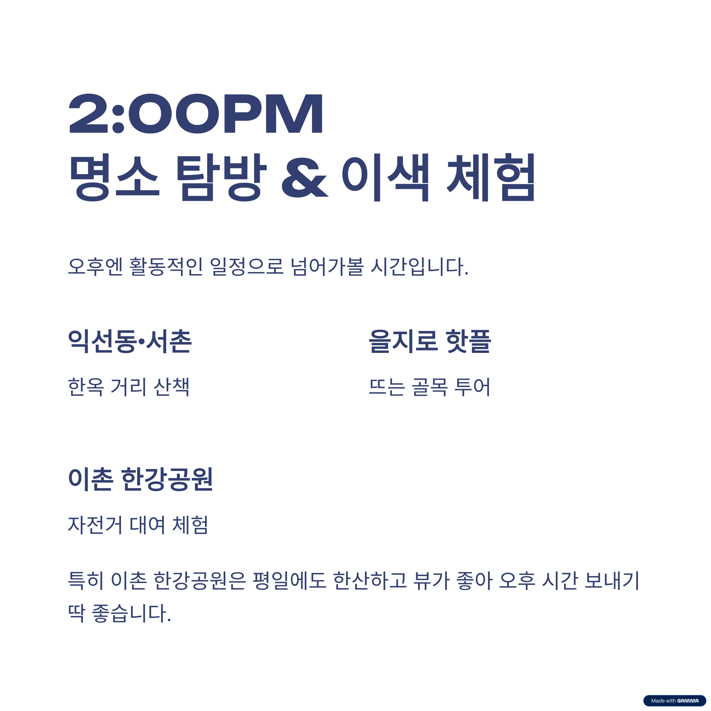 2:00PM, 지역별 명소 탐방 or 이색 체험