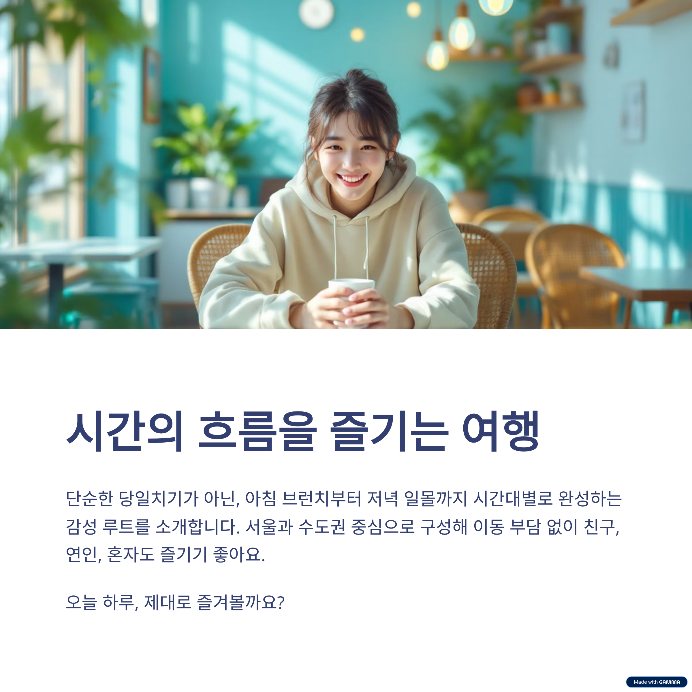 단순한 당일치기 여행이 아니라 ‘시간의 흐름’까지 즐기고 싶다면? 아침엔 브런치로 여유롭게 시작하고, 오후엔 걷고 보고 느끼며, 저녁엔 일몰을 바라보며 마무리하는 하루 루트를 제안합니다. 서울과 수도권 중심으로 이동 부담 없이 구성했으니, 친구와 연인, 혼자도 즐기기 좋아요.
