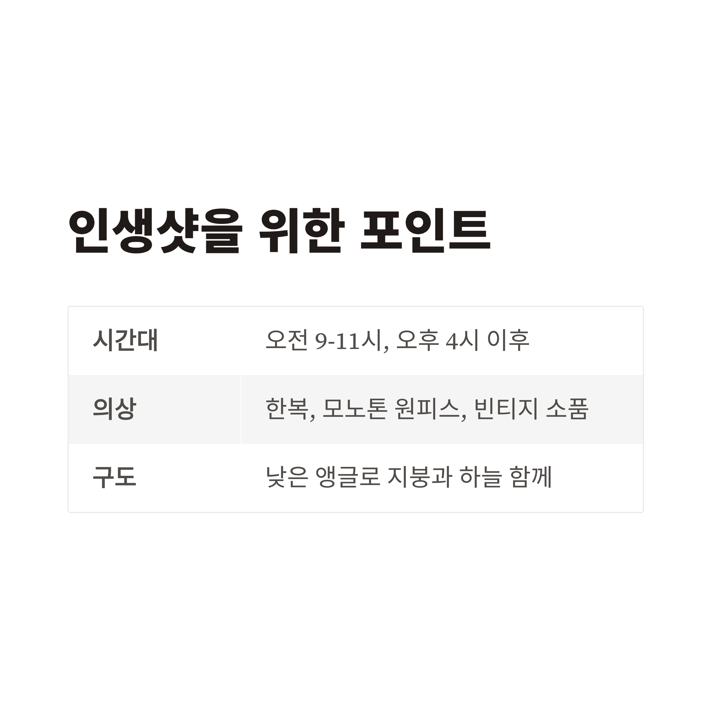 | 의상 | 한복 or 모노톤 원피스, 빈티지한 소품 활용 |
